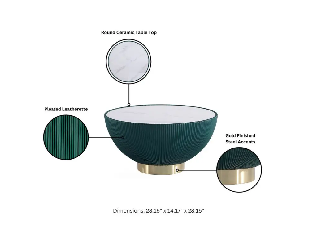 Introducing our striking Modern Anderson Coffee Table, a versatile addition to your living and dining spaces. Crafted with artistic flair, it features unique leatherette pleating and beautiful gold metal finishes that add a touch of stunning design to your home decor. Built with a high-quality steel frame and feet, this table effortlessly combines style and durability. Pair it with our Manhattan Comfort End Tables to create a cohesive and stylish look, making your living and dining areas stand out.