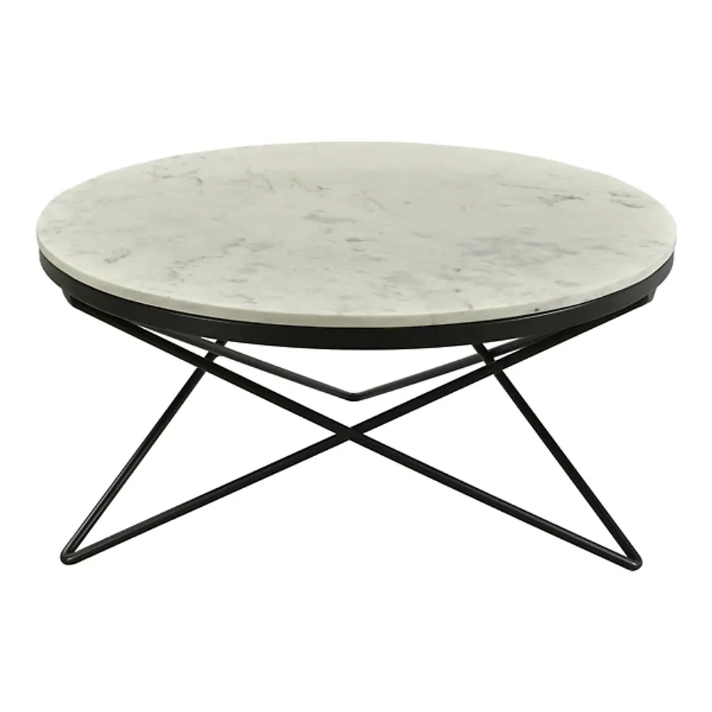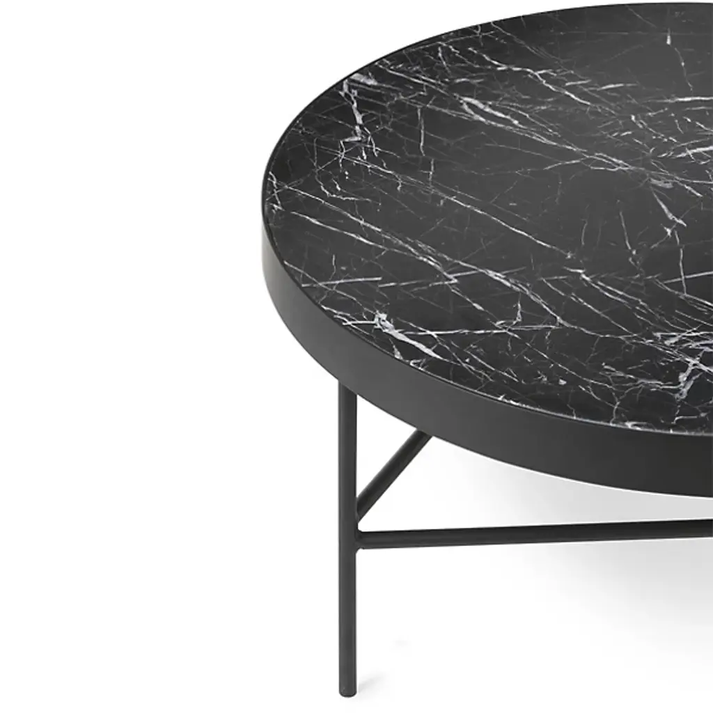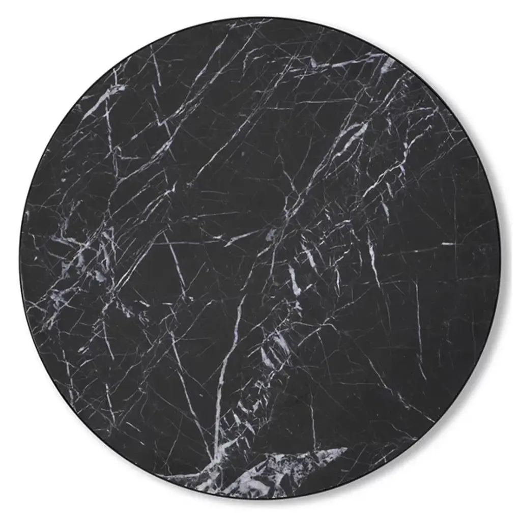 The Marble Coffee Table from Ferm Living offers a rich, natural presence to inside living spaces. Each piece is made in Bosnia and features a uniquely veined surface with individual variations, contrasting a vibrant, textured top with a dark, smooth edge. A thick disc tabletop of Black Marquina Marble crowns a tripod base of powder-coated steel, contrasting a heavier top with the slender supports below, thereby juxtaposing earthy elegance with airy negative space.