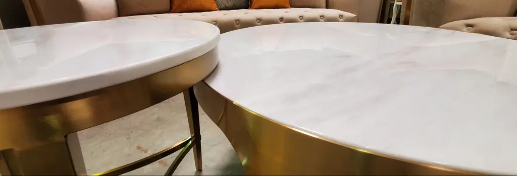 Features an elegant cream marble top with Amazing gold chrome trim. The table Set comes in 2 pieces and con be configured to any need of the space its put in.