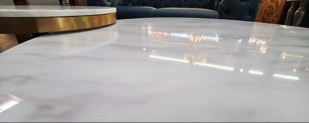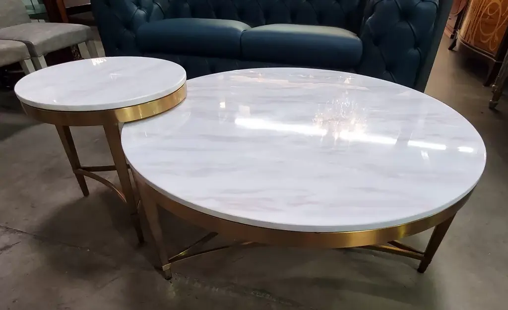Features a Round marble top Coffee table with gold chrome accent, and matches nicely with a leather set and sectional