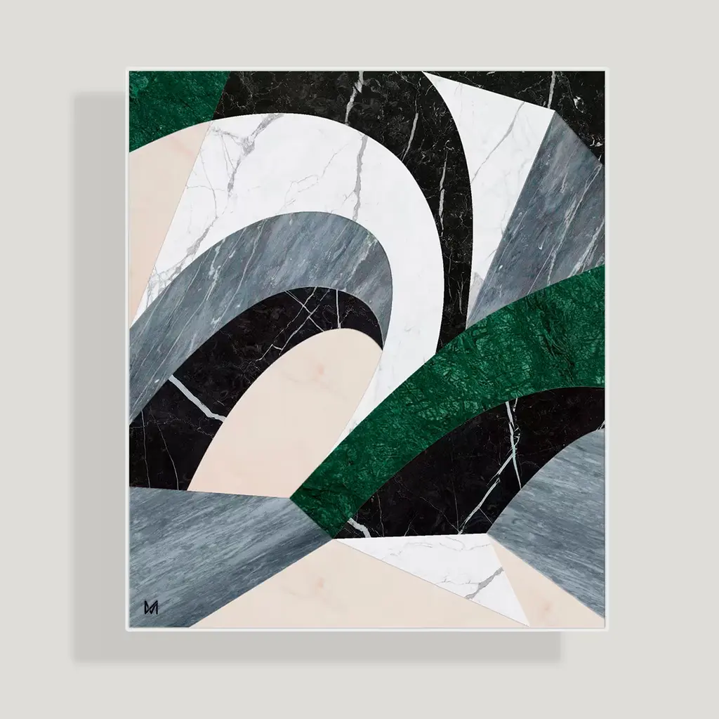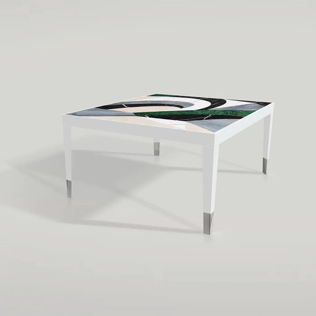 An evocative tribute to Turin's historic boulevard's arched porticoes, this stunning Via Roma large coffee table boasts a glossy white wood frame with exquisite marble inlays creating impressive chromatic contrasts in its abstract pattern. Embellished by White Statuario, Rose Portugal, Bardiglio, and Black Marquinia stone, it is also graced with polished steel feet for a chic accent piece in an elegant living interior. May be matched with similar elements from the same Collection.
