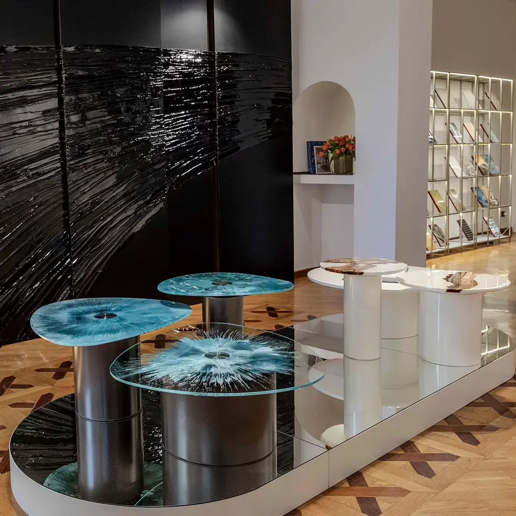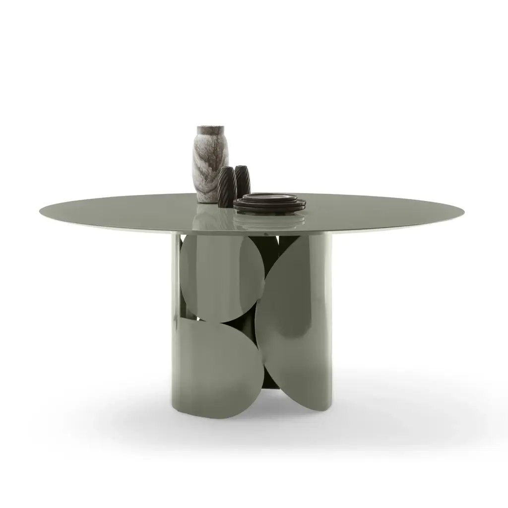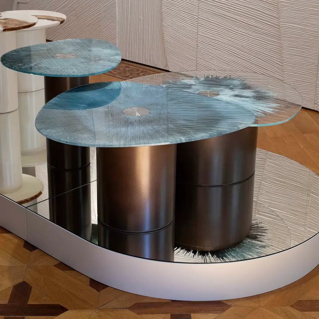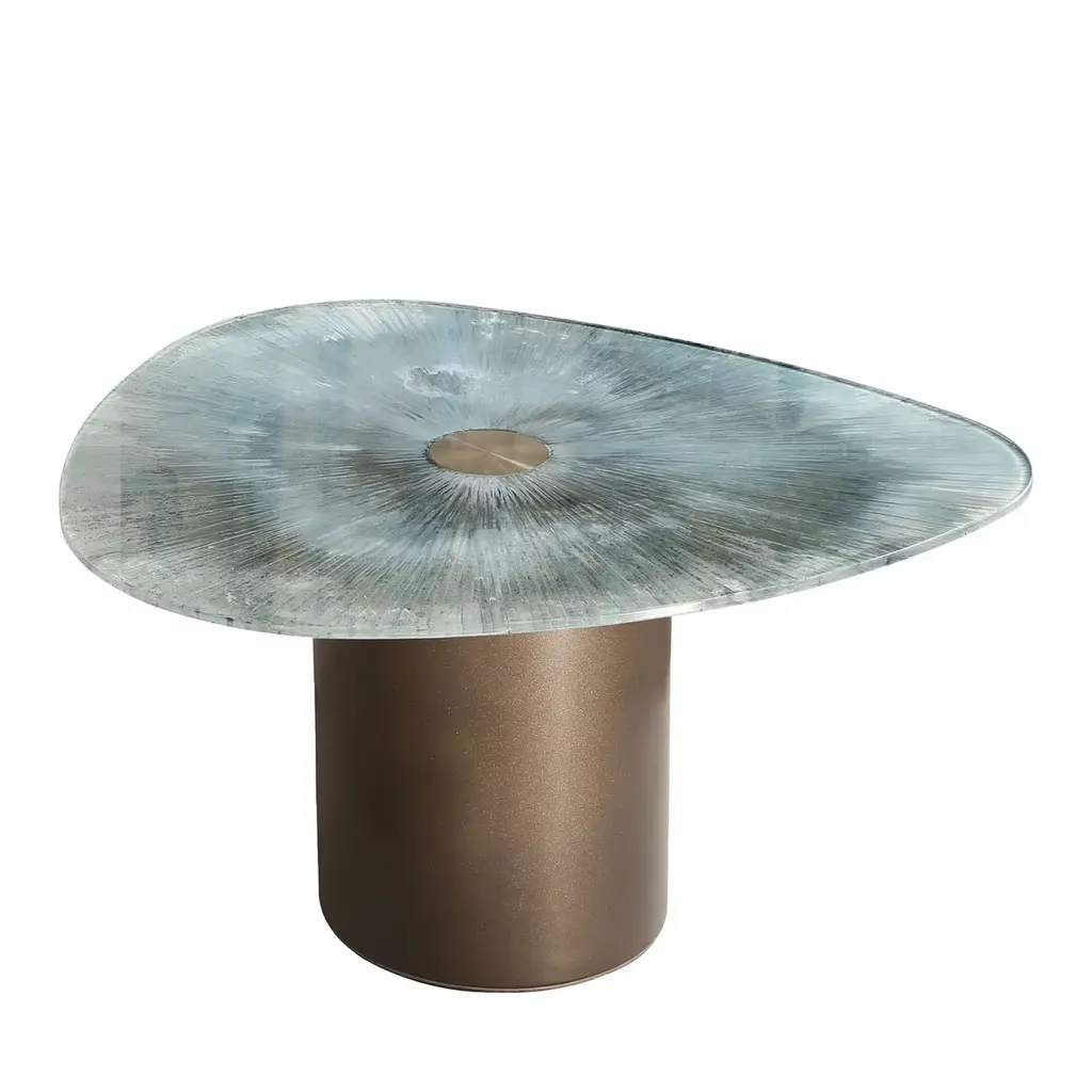 Delicate irregularities and clean geometric volumes are artfully merge in this exclusive coffee table. Part of the Marea Collection, it consists of a bold cylindrical wooden base offered in an elegant metallic finish and sustaining an irregularly-shaped tempered glass top whose back flaunts a unique manual decoration. Please contact the Concierge for information about available variants.