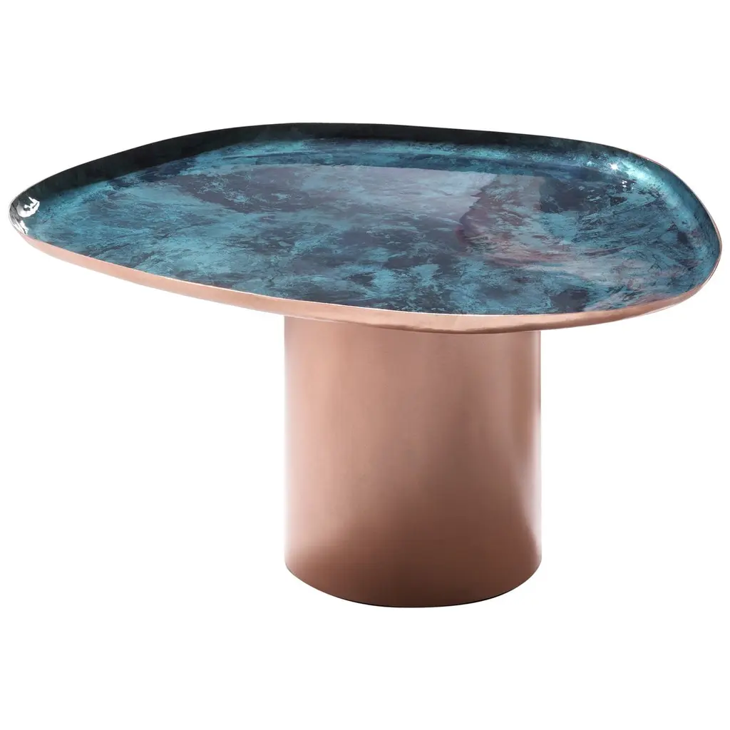 A triumph of contrasts marks this stunning coffee table, a singular piece that stands out for the eye-catching motif recalling a thin ice slab adorning the underside of the tempered glass top. Finished with an elegant metallic dark lacquer, the cylindrical wooden base effortlessly counterbalances the top's eccentric look. Different size options are available in the Artemest catalog.