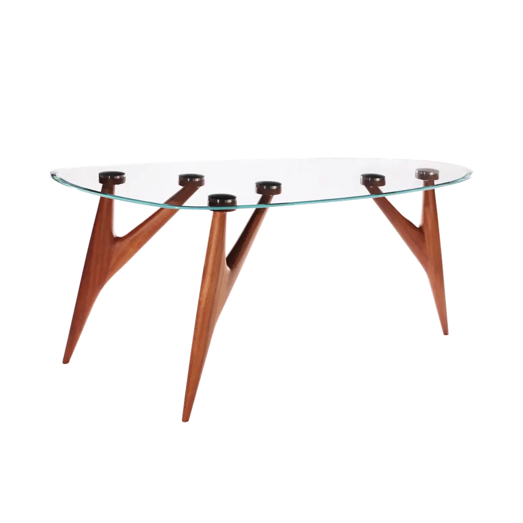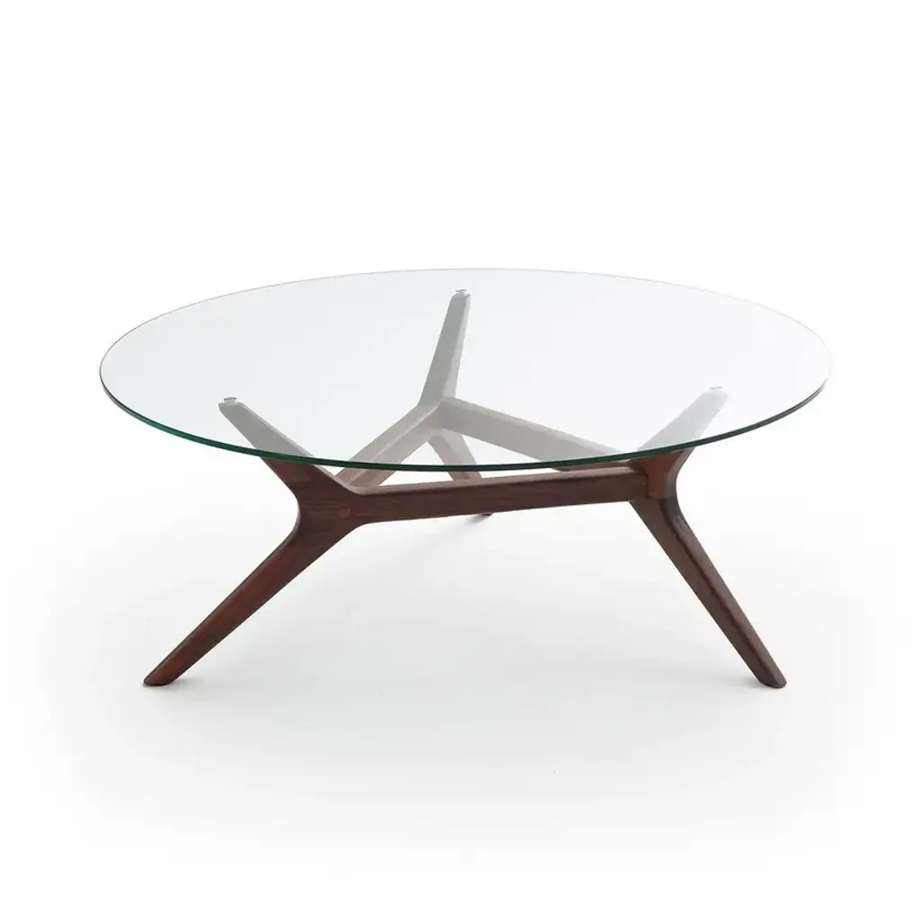 The elegant and refined Maricielo coffee table has a glass top that uncovers its solid wood base with a geometric design. Use alone or in combination with its taller version.8 mm thick toughened glass top.Solid walnut frame with polyurethane finish