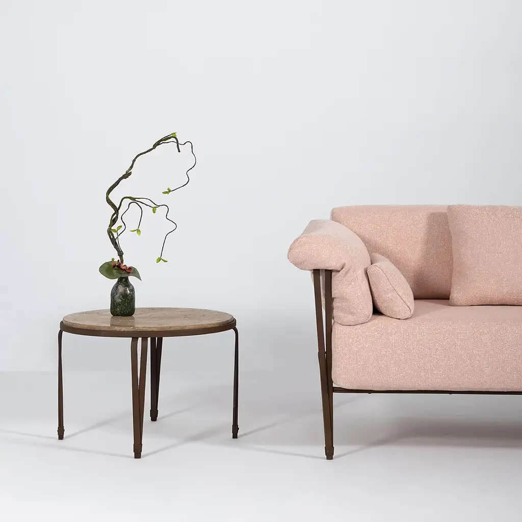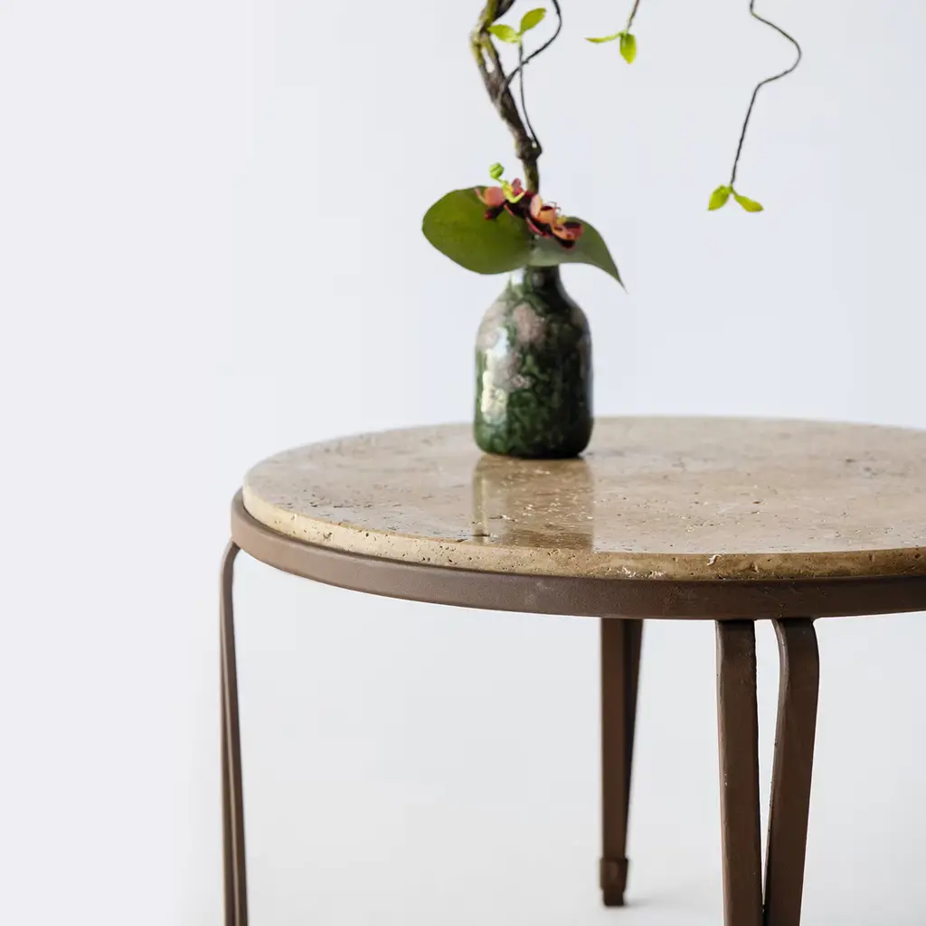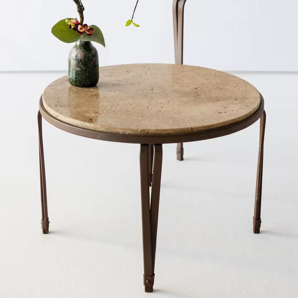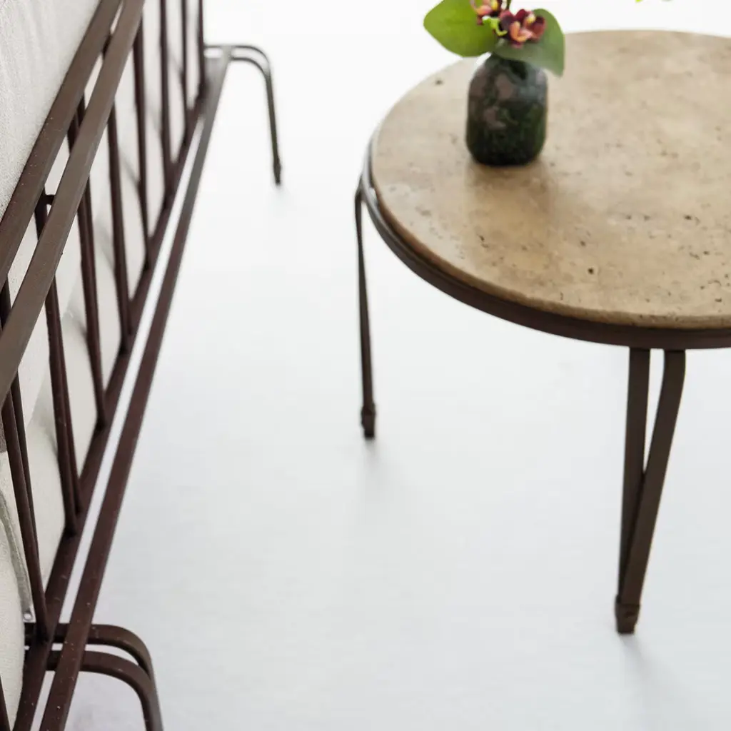 Inspired by traditional Florentine designs, the Marina Coffee Table boasts a beautiful inox steel base.Topped with a walnut travertine top, this outdoor table is defined by clean lines for a timeless allure. Perfect for plants, snacks or drinks, this table makes a sophisticated addition to any patio, garden or terrace.