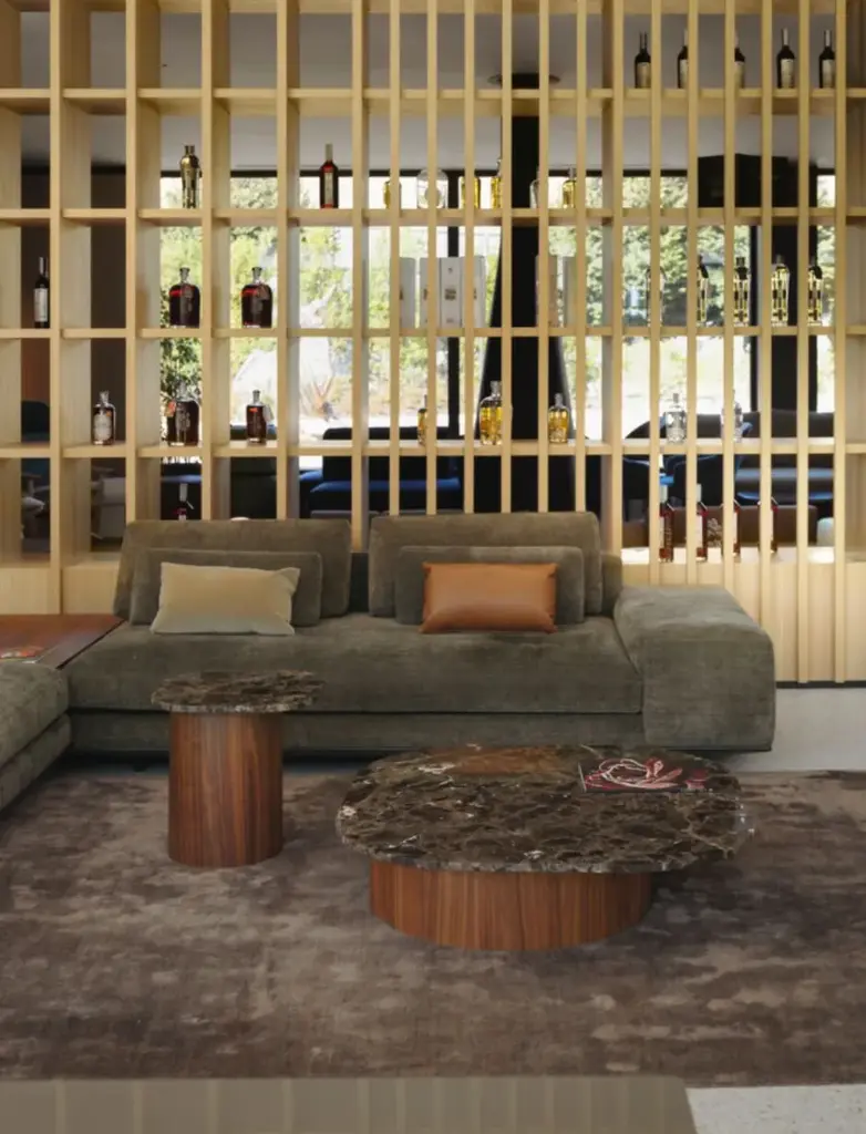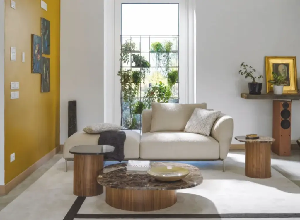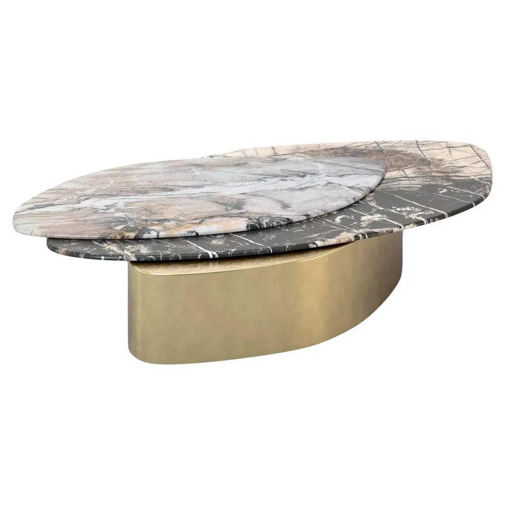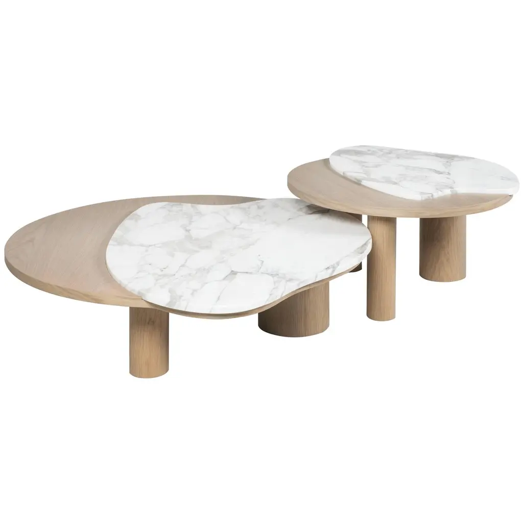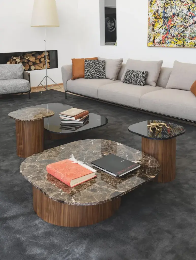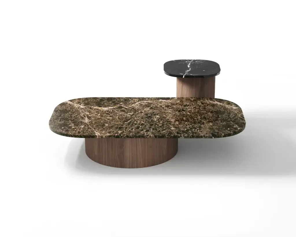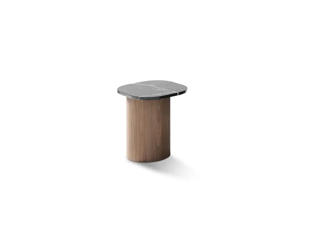 Marina is a family of tables and coffee tables whose essence lies in the harmonious disproportion between cylindrical walnut legs and a strict marble top. The forms are inspired by the 'Marine' paintings of the Venetian artist Virgilio Guidi, in which the master can evoke a lagoon landscape with few and seemingly simple strokes, the result of a synthesis that leans towards abstraction. The Marina collection synthesizes the traditional lines of the table into a few strokes, eliminating unnecessary design, and using wood and marble to achieve skillful and evocative shapes.Base made of curved MDF and veneered with Canaletto walnut pressed by mold. Marble top, 2 cm thick.