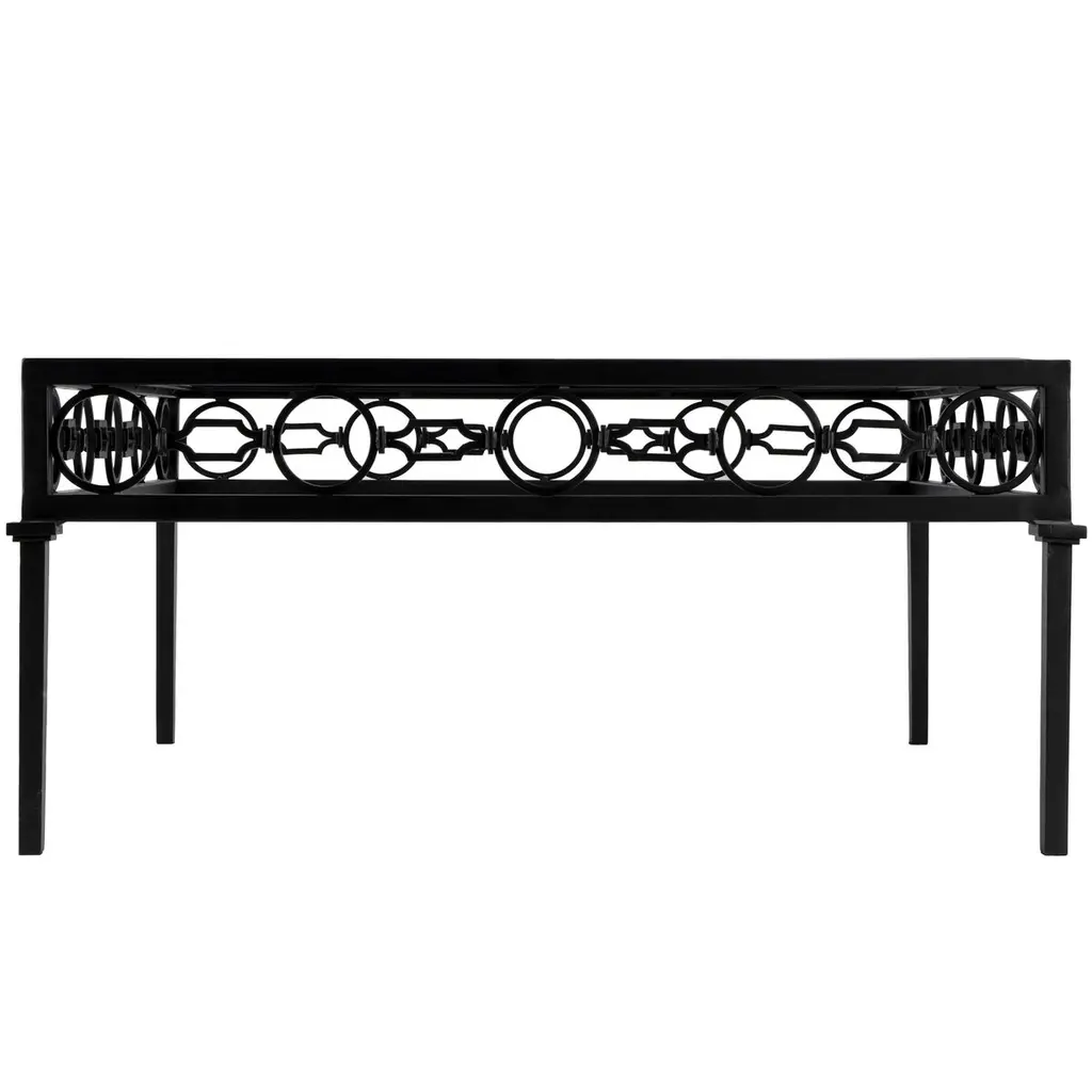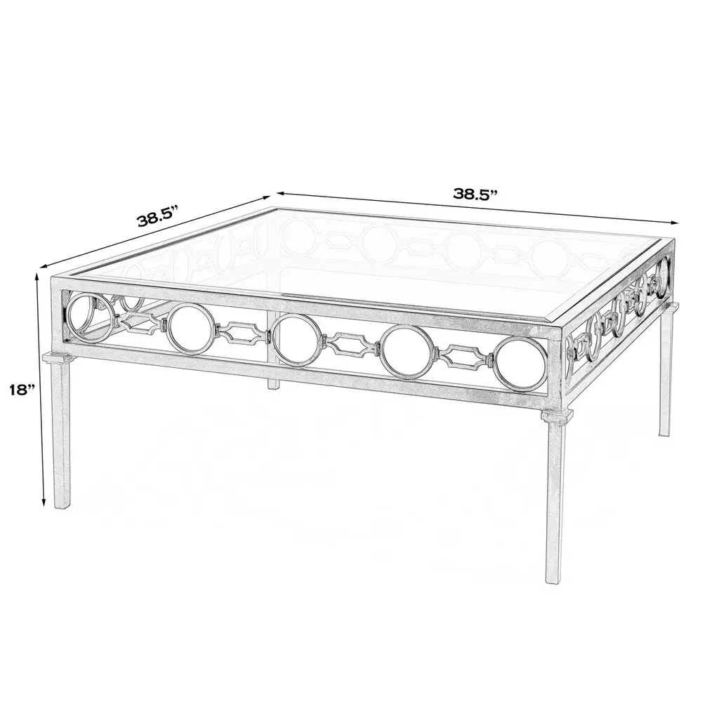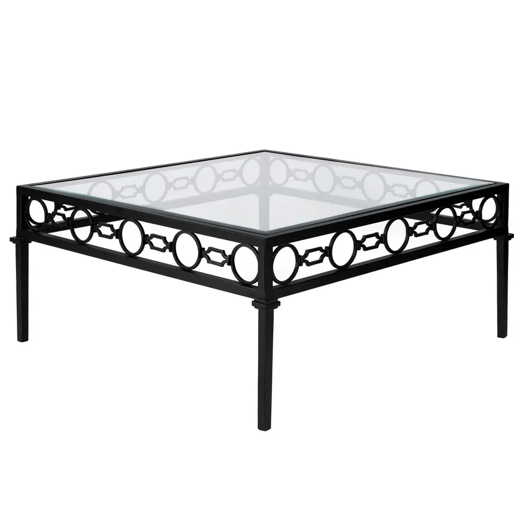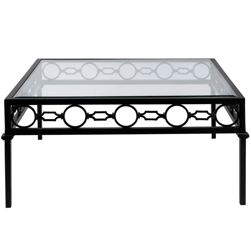 It's 5 o'clock somewhere. Grab a drink and cozy up around this elegant coffee table. Featuring a black iron frame and a clear glass top, the table is substantial in size, measuring 38.5"W x 38.5D x18"H, and showcases a forged geometric pattern.