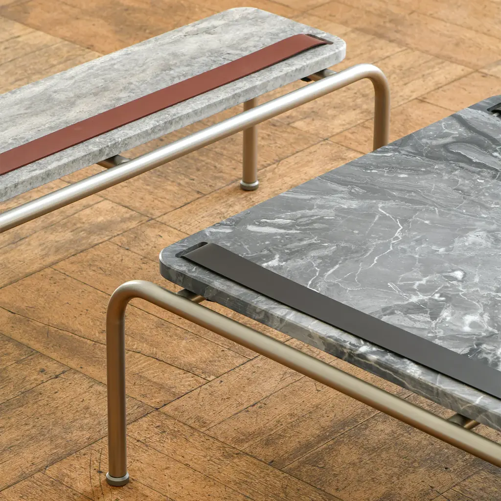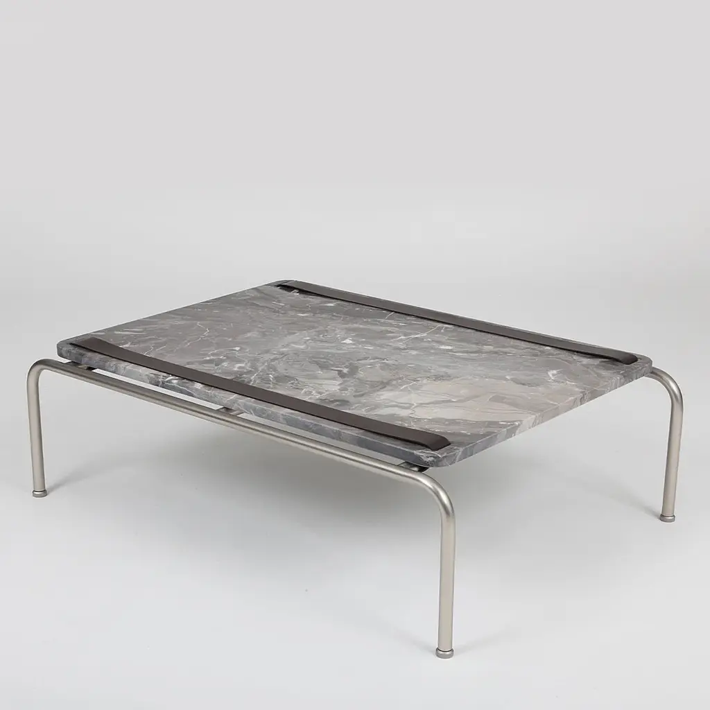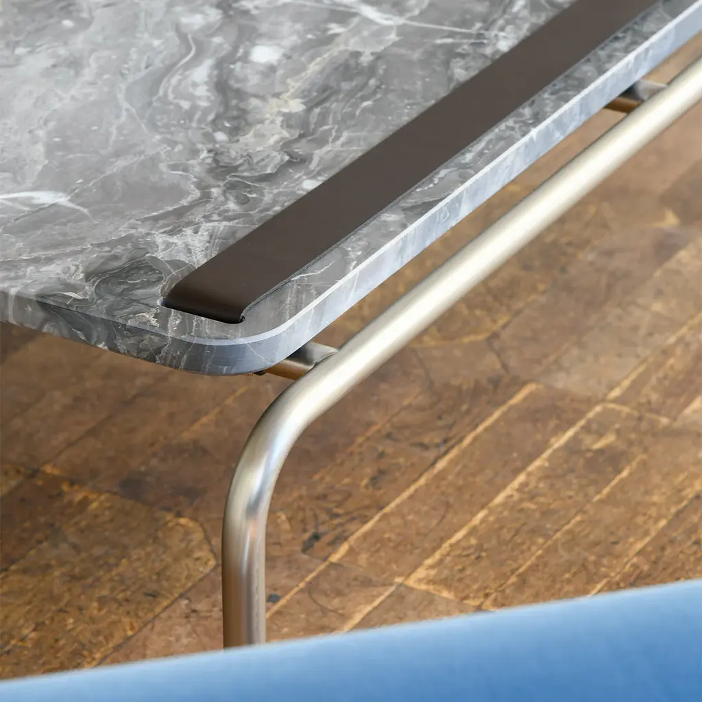 Rendered with spectacular harmony and elegance, this coffee table combines soft and hard materials, contrasting in hues and textures to reveal a sophisticated final product. Resting on a sleek chromed metal base, it features a marble top enriched with two leather belts. This piece is customizable in size and finishes, please consult the Concierge for further information.