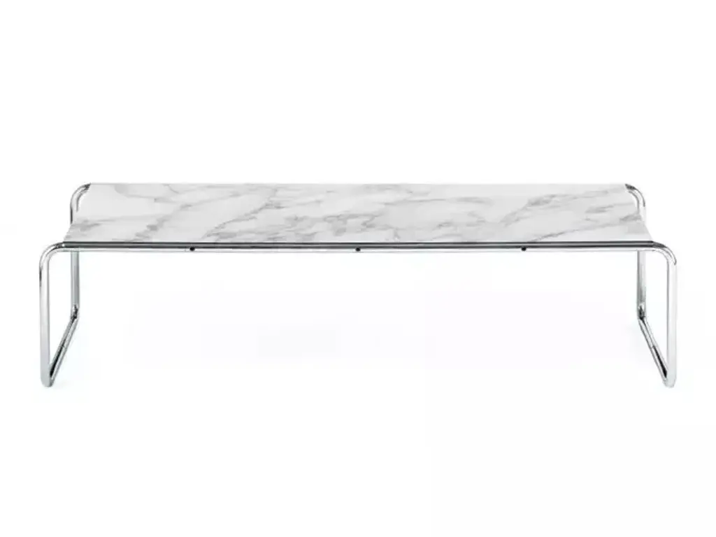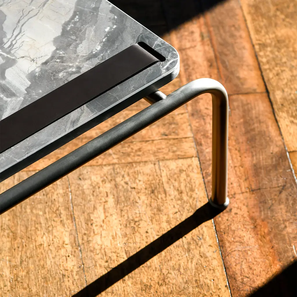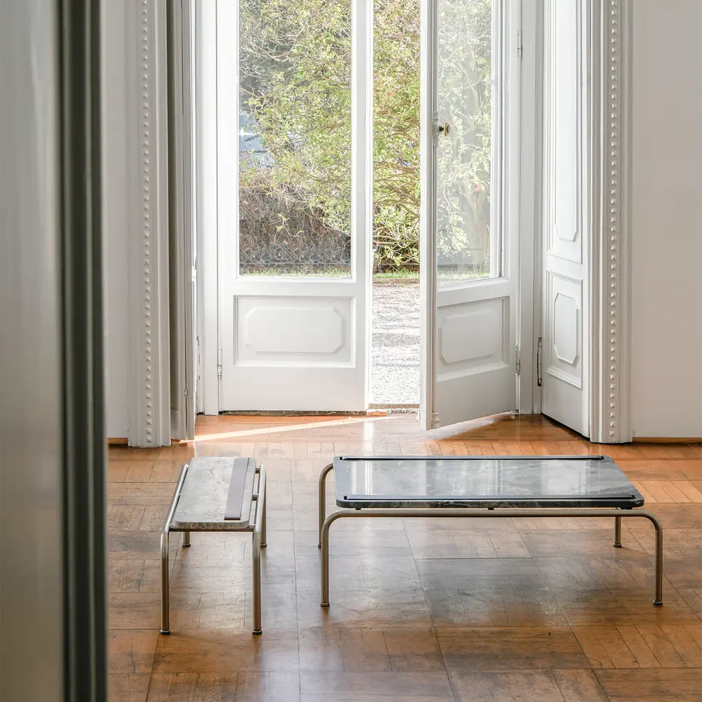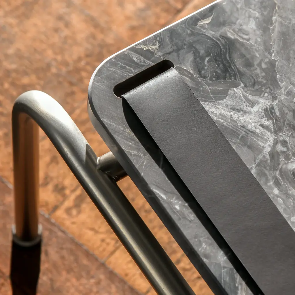 Rendered with spectacular harmony and elegance, this coffee table combines soft and hard materials, contrasting in hues and textures to reveal a sophisticated final product. Resting on a sleek chromed metal base, it features a marble top enriched with two leather belts. This piece is customizable in size and finishes, please consult the Concierge for further information.