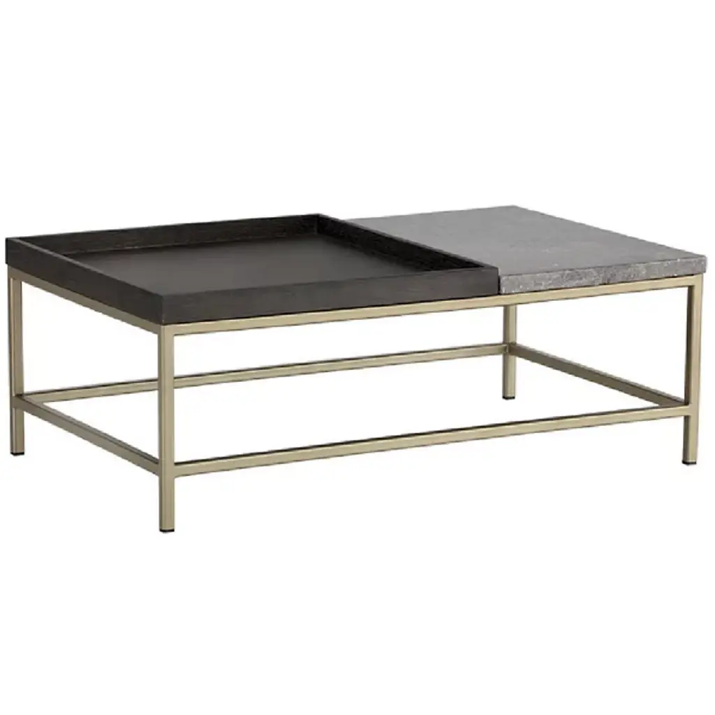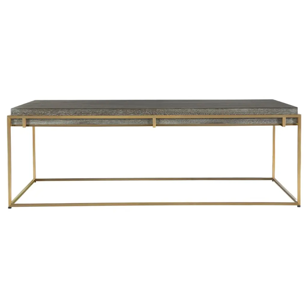 The Mateus Coffee Table is a masterpiece of contemporary design, where elegance meets functionality. Its acacia veneer top, kissed by a dark walnut stain and gently caressed by a light gray glaze, creates a surface that is both inviting and sophisticated. This exquisite top is gracefully suspended within a stainless steel framework, plated in luxurious brushed brass, offering a harmonious blend of materials that exudes timeless charm. The Mateus Coffee Table is not just a piece of furniture; it is a statement of style, a centerpiece that invites admiration and conversation in any living space.
