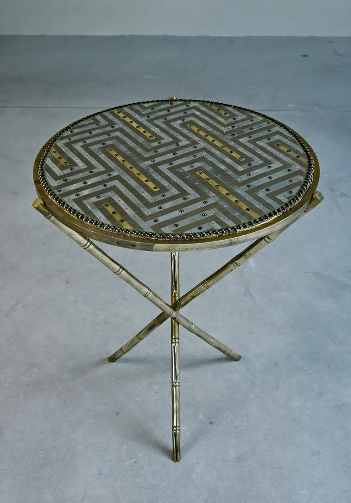Maymuna Coffee Table by Valentina GiovandoDimensions: D 50 x H 67 cm.Materials: Wood, Brass, Zinc, Fabric, Fiberglass. Valentina Giovando, Lives and works in Sarzana, in Liguria, and for over 20 years she dedicated herself to the production of a new style. Her style is personal and full of splendour that she declines in the interior decoration through a range of high-craft artistic products. All these products are completely hand-made. Everything contributes to create unique and original pieces that mix ancient and modern, primitive and industrial, poor and precious materials, in a fascinating mix, by the capable Valentinaʼ and her artisanal team hands.