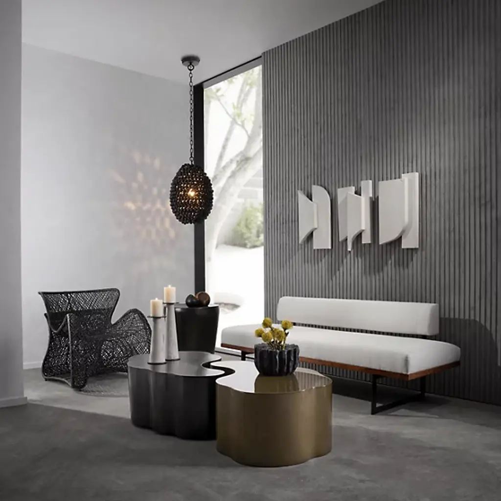 Some furnishings have a unique ability to look good on their own or together with a copy of themselves, the Meadow Cocktail Table from Arteriors is one of those furnishings. Its uniquely shaped construction softens up living rooms through its soft curves that transition neatly one by one. Its semi-reflective surface creates a refined contour outline of the overall piece. Its iron construction assures a stable base for those tasty cocktails. The piece balances on the line of elegant and sophisticated with chic and playful.