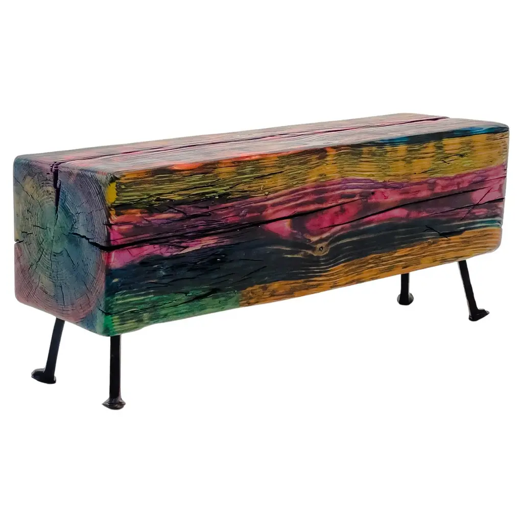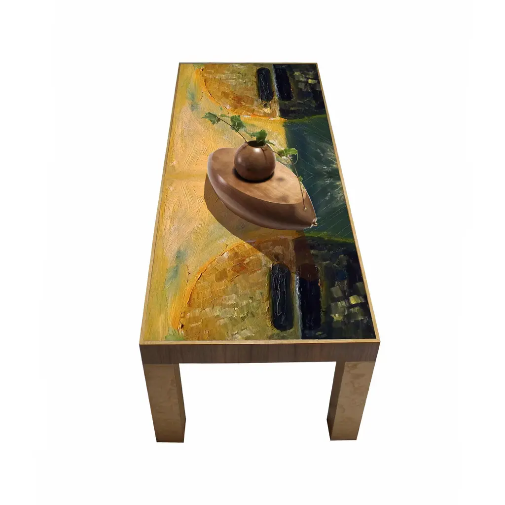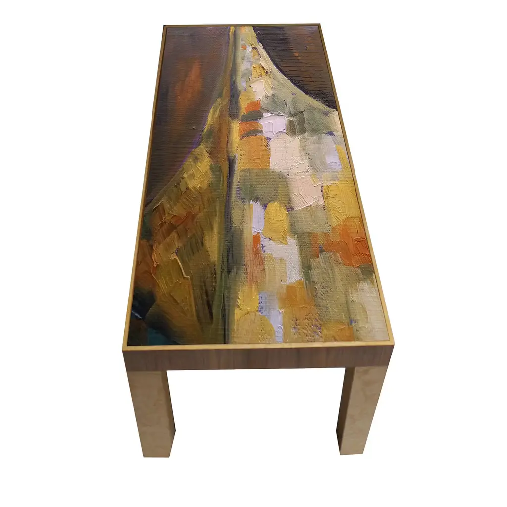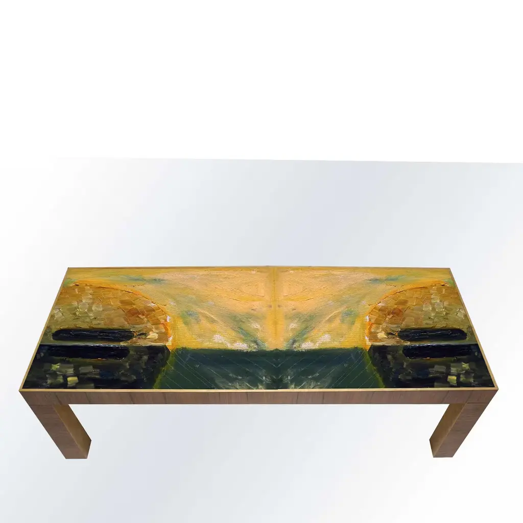 A stately and iconic design that will effortlessly stand out in a contemporary interior, this coffee table belongs to a limited edition of 10 numbered pieces created by Mascia Meccani in 2022. Handcrafted of briar-root and walnut-finished wood, it features a stupendous top painted by hand in an abstract design that draws inspiration from Ferdinando Meccani's oil paintings from the '60s and '70s. It is customizable in size and wood essence upon request to the Concierge.