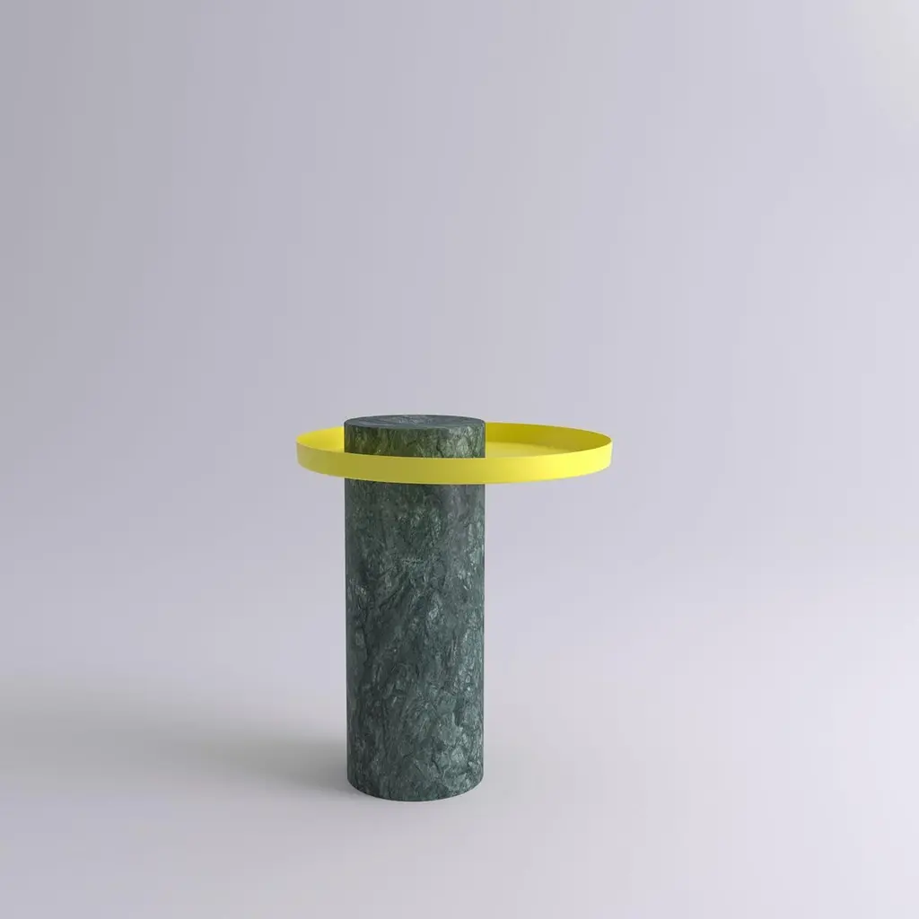 Medium indian green contemporary guéridon, Sebastian HerknerDimensions: D 40 x H 46 cm.Materials: Indian green marble, yellow metal tray.The salute table exists in 3 sizes, 4 different marble stones for the column and 5 different finishes for the tray for a virtually endless number of configurations. In addition, salute can be made bespoke with special colors materials and stones.Salute is a family of tables mixing marble and metal for a high visual impact. As an occasional table, Salute is the perfect companion to your iconic armchair or next to a comfy sofa, with its clean lines and yet strong personality and impact. As a combination of tables, it is a sculptural coffee table that you can customize and adapt both in dimensions and colors.Salute is a family of guéridon tables.Each element can be used alone or combined together to play with different heights and formats as well as combinations of materials. The strong presence of the marble columnis lightened by the suspended shape of the metal tray.Sebastian Herkner is the rising star of German design. He collaborates extensively with the best Italian and German brands (Moroso, ClassiCon,..) with product that share an tasteful and rigorous simplicity, with a focus on materials and textures.
