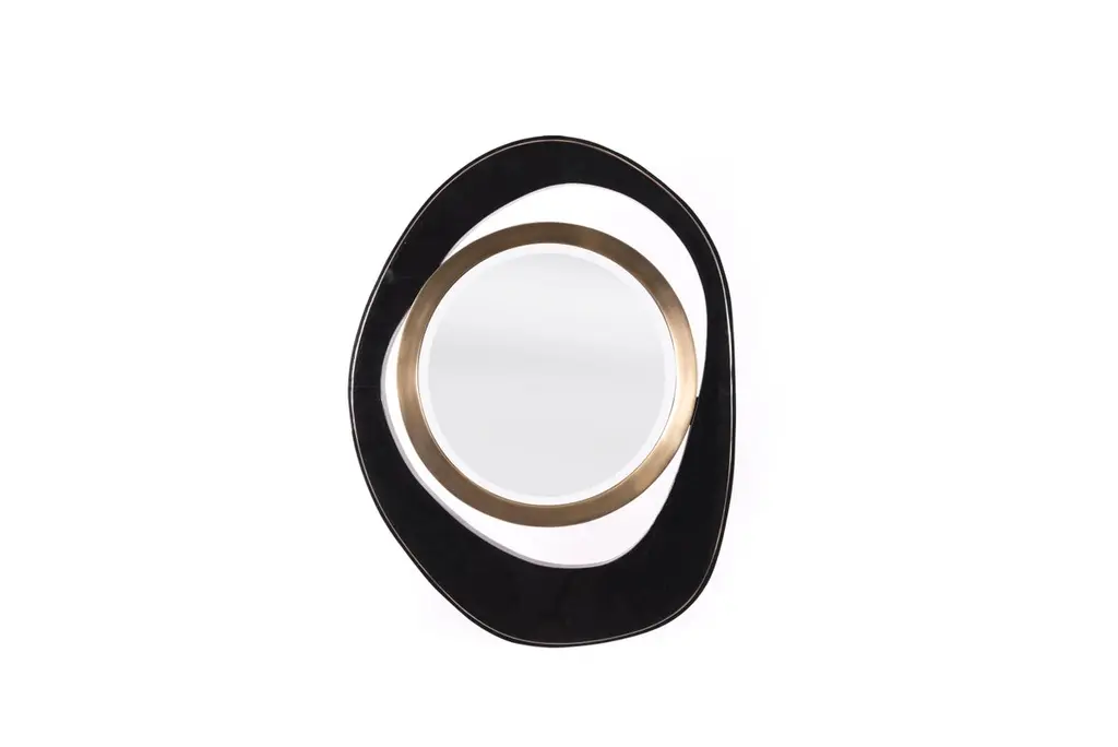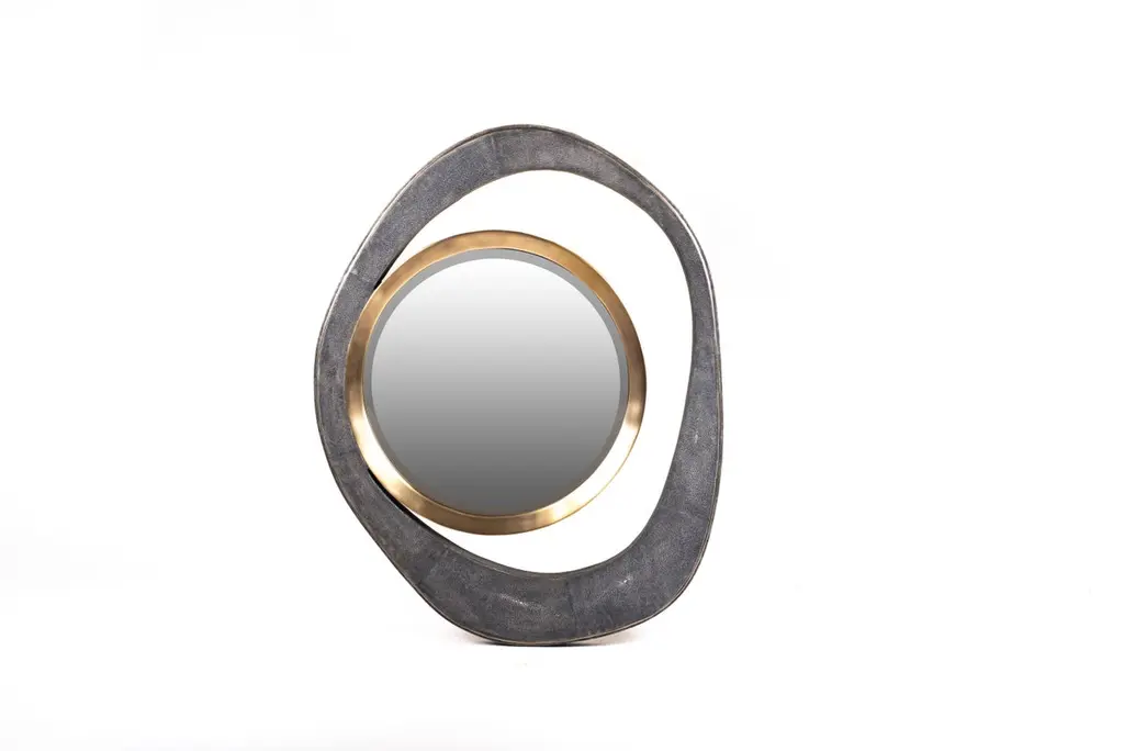 The Paris based label has distinguished themselves since their launch, with their iconic use of shagreen mixed with brass and other exotic materials. All furniture is handcrafted by skilled artisans, ultimately making each piece unique, designed in Paris and produced in the Philippines.The peacock mirror in black pen shell and bronze-patina brass details is inspired by R&Y Augousti’s iconic nesting coffee tables is the perfect accent piece to dress up any wall. The black one shell has color tonalities in it creating a dramatic finish. Available in cream shagreen and a large size in black shagreen, see images at end of slide.All shell pieces are hand-selected before being inlaid making each mirror a one of a kind.The dimensions of this piece are 78 X 58 X 4.5 cm / 30.75" x 23" x 2"All R&Y Augousti pieces are handmade by artisans, ultimately making each piece unique. Custom color/sizing available on request. Wipe clean with soft dry cloth.Acclaimed design duo Ria & Yiouri Augousti have established themselves since the 1990s as pioneers of modern-vintage style through their luxurious Art Deco inspired collections.The Paris based label has distinguished themselves since their launch, with their iconic use of shagreen mixed with brass and other exotic materials. All furniture is handcrafted by skilled artisans, ultimately making each piece unique. All shagreen-covered items should be kept out of direct sunlight, color variants may occur on the stingray and other exotic finishes, but this showcases the Parisian label's commitment to creating authentic luxurious products using natural components.