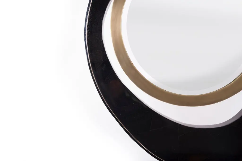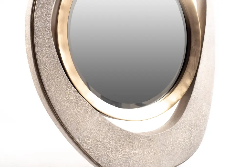 The Paris based label has distinguished themselves since their launch, with their iconic use of shagreen mixed with brass and other exotic materials. All furniture is handcrafted by skilled artisans, ultimately making each piece unique, designed in Paris and produced in the Philippines.The peacock mirror in black pen shell and bronze-patina brass details is inspired by R&Y Augousti’s iconic nesting coffee tables is the perfect accent piece to dress up any wall. The black one shell has color tonalities in it creating a dramatic finish. Available in cream shagreen and a large size in black shagreen, see images at end of slide.All shell pieces are hand-selected before being inlaid making each mirror a one of a kind.The dimensions of this piece are 78 X 58 X 4.5 cm / 30.75" x 23" x 2"All R&Y Augousti pieces are handmade by artisans, ultimately making each piece unique. Custom color/sizing available on request. Wipe clean with soft dry cloth.Acclaimed design duo Ria & Yiouri Augousti have established themselves since the 1990’s as pioneers of modern-vintage style through their luxurious art-deco inspired collections.The Paris based label has distinguished themselves since their launch, with their iconic use of shagreen mixed with brass and other exotic materials. All furniture is handcrafted by skilled artisans, ultimately making each piece unique. All shagreen-covered items should be kept out of direct sunlight, color variants may occur on the stingray and other exotic finishes, but this showcases the Parisian label's commitment to creating authentic luxurious products using natural components.