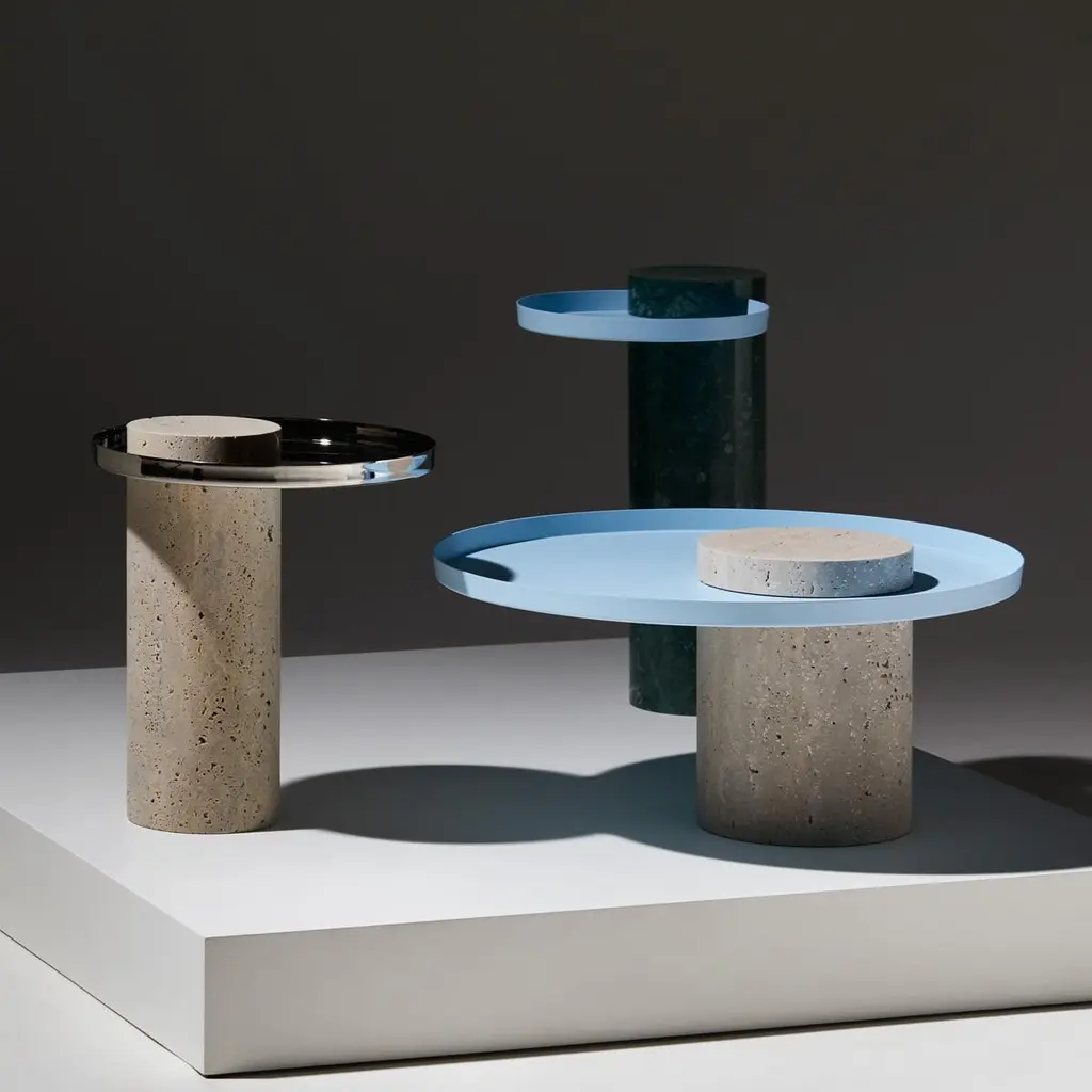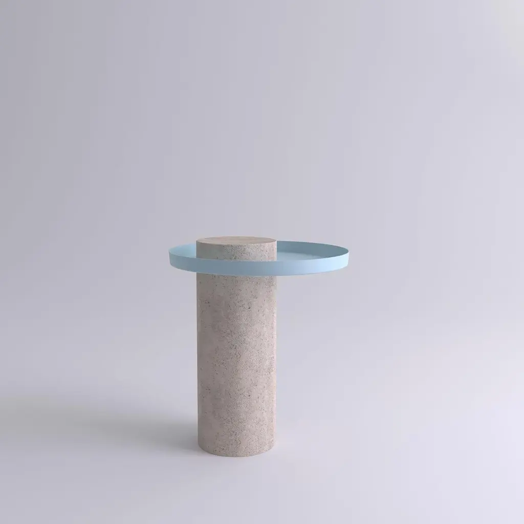 Medium travertine contemporary guéridon, Sebastian HerknerDimensions: D 40 x H 46 cmMaterials: Travertine stone, light blue metal trayThe salute table exists in 3 sizes, 4 different marble stones for the column and 5 different finishes for the tray for a virtually endless number of configurations. In addition, salute can be made bespoke with special colors materials and stones.Salute is a family of tables mixing marble and metal for a high visual impact. As an occasional table, Salute is the perfect companion to your iconic armchair or next to a comfy sofa, with its clean lines and yet strong personality and impact. As a combination of tables, it is a sculptural coffee table that you can customize and adapt both in dimensions and colors.Salute is a family of guéridon tables.Each element can be used alone or combined together to play with different heights and formats as well as combinations of materials. The strong presence of the marble columnis lightened by the suspended shape of the metal tray.Sebastian Herkner is the rising star of German design. He collaborates extensively with the best Italian and German brands (Moroso, ClassiCon,..) with product that share an tasteful and rigorous simplicity, with a focus on materials and textures.