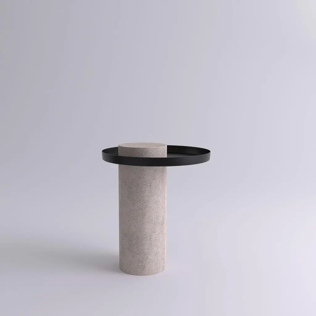 Medium travertine contemporary guéridon, Sebastian HerknerDimensions: D 40 x H 46 cmMaterials: Travertine stone, black metal trayThe salute table exists in 3 sizes, 4 different marble stones for the column and 5 different finishes for the tray for a virtually endless number of configurations. In addition, salute can be made bespoke with special colors materials and stones.Salute is a family of tables mixing marble and metal for a high visual impact. As an occasional table, Salute is the perfect companion to your iconic armchair or next to a comfy sofa, with its clean lines and yet strong personality and impact. As a combination of tables, it is a sculptural coffee table that you can customize and adapt both in dimensions and colors.Salute is a family of guéridon tables.Each element can be used alone or combined together to play with different heights and formats as well as combinations of materials. The strong presence of the marble columnis lightened by the suspended shape of the metal tray.Sebastian Herkner is the rising star of German design. He collaborates extensively with the best Italian and German brands (Moroso, ClassiCon,..) with product that share an tasteful and rigorous simplicity, with a focus on materials and textures.