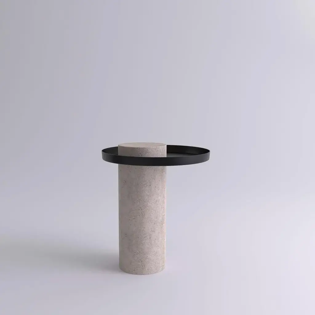 Medium travertine contemporary guéridon, Sebastian Herkner Dimensions: D 40 x H 46 cm Materials: Travertine stone, black metal tray The salute table exists in 3 sizes, 4 different marble stones for the column and 5 different finishes for the tray for a virtually endless number of configurations. In addition, salute can be made bespoke with special colors materials and stones. Salute is a family of tables mixing marble and metal for a high visual impact. As an occasional table, Salute is the perfect companion to your iconic armchair or next to a comfy sofa, with its clean lines and yet strong personality and impact. As a combination of tables, it is a sculptural coffee table that you can customize and adapt both in dimensions and colors. Salute is a family of guéridon tables. Each element can be used alone or combined together to play with different heights and formats as well as combinations of materials. The strong presence of the marble column is lightened by the suspended shape of the metal tray. Sebastian Herkner is the rising star of German design. He collaborates extensively with the best Italian and German brands (Moroso, ClassiCon,\.) with product that share an tasteful and rigorous simplicity, with a focus on materials and textures. This piece is attributed to the mentioned designer/maker. It has no attribution mark and no official proof of authenticity, however it is well documented in design history. I take full responsibility for any authenticity issues arising from misattribution