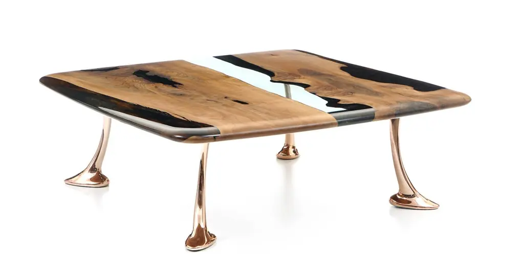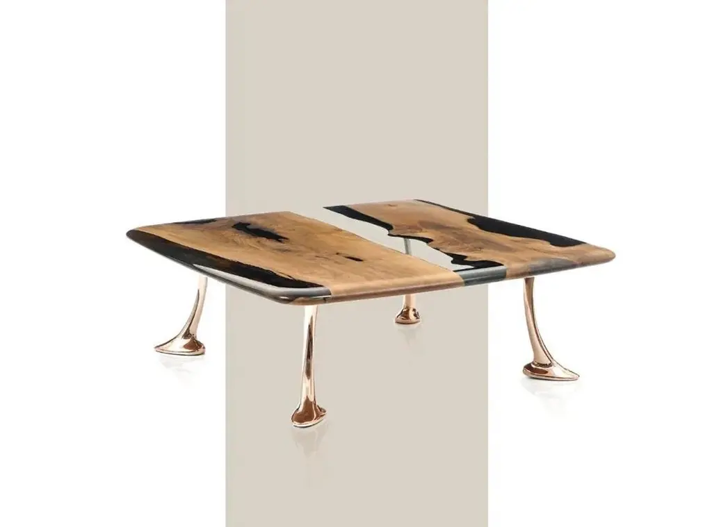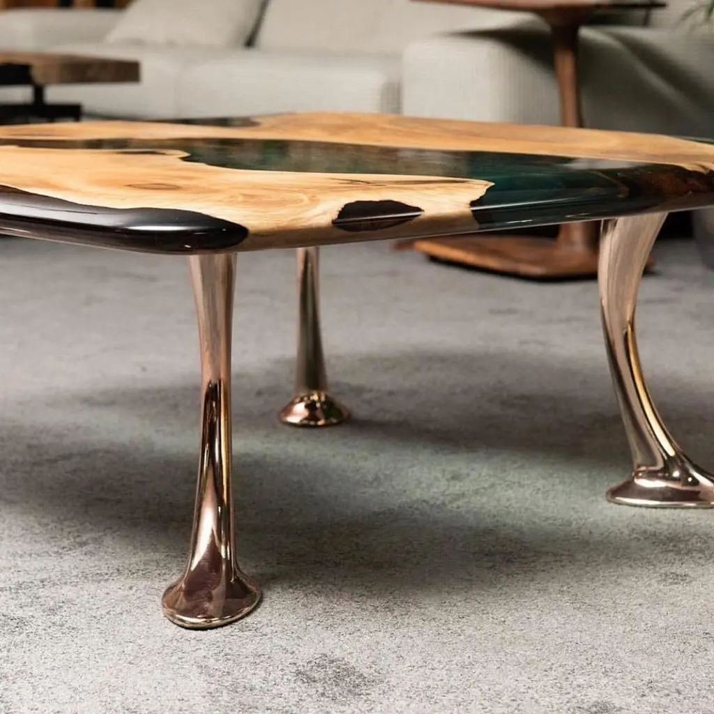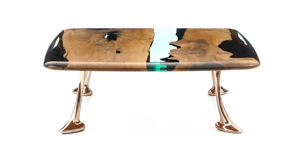 Introducing the stunning MEDMA coffee table - an exceptional piece of furniture that is sure to enhance the aesthetics of your living space. Crafted from premium quality walnut wood, this table boasts a smooth and sleek surface that is finished with a crystal-clear resin epoxy. Not only does this finish add an extra layer of durability, but it also adds to the table's overall style and sophistication.The table top features an eased edge that not only looks great but also provides a comfortable and functional surface for you to place your drinks, books, and other items. The table's gold-plated aluminum legs are the epitome of elegance and complement the design perfectly. With the MEDMA coffee table, you can take your home decor to the next level and impress your guests with your impeccable taste.This exquisite coffee table is a perfect addition to any living space. It is made from high-quality walnut wood and finished with a crystal-clear resin epoxy that adds to its durability and style. The table top has an eased edge that provides a comfortable and functional surface. The aluminum gold-plated legs add an elegant touch to the design. With the MEDMA coffee table, you can elevate your home decor to the next level.Our products are customizable and made to order with varying materials and finishes. Please note that the cost may vary depending on the level of customization. Lead time will be confirmed upon inquiry.