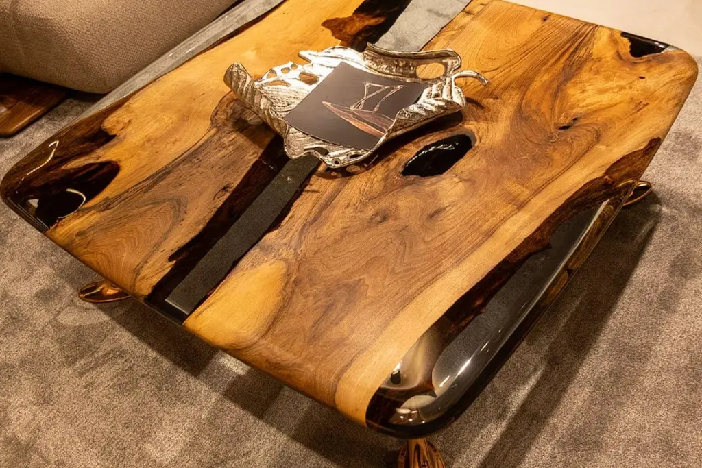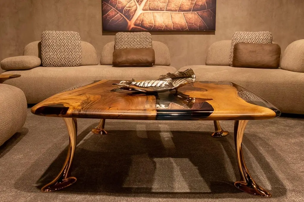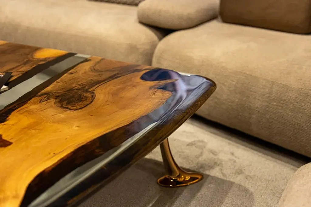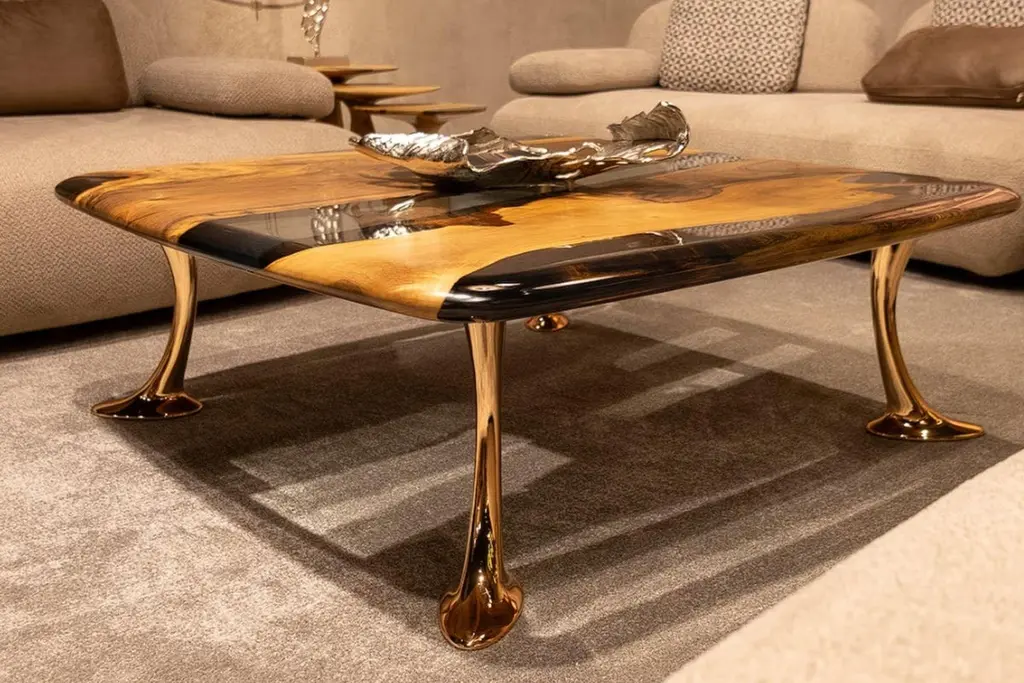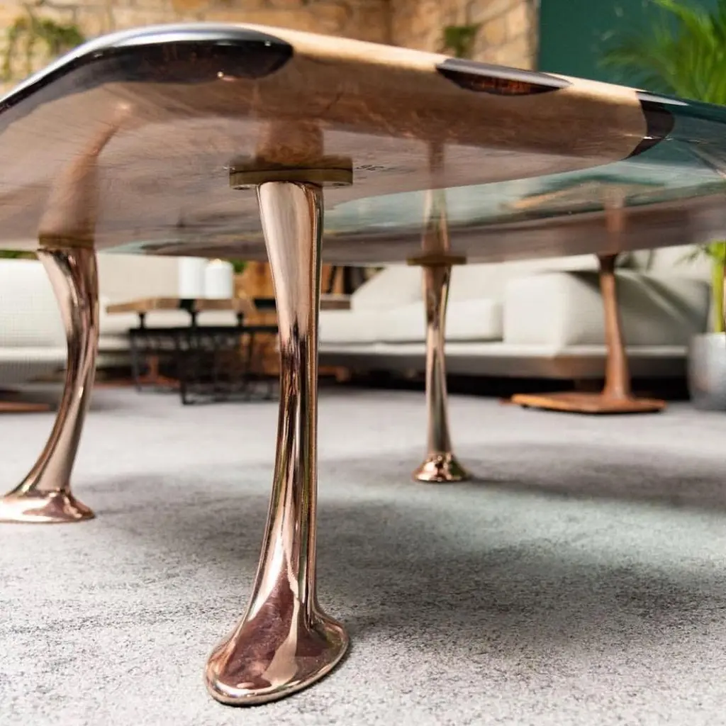 Introducing the stunning MEDMA coffee table - an exceptional piece of furniture that is sure to enhance the aesthetics of your living space. Crafted from premium quality walnut wood, this table boasts a smooth and sleek surface that is finished with a crystal-clear resin epoxy. Not only does this finish add an extra layer of durability, but it also adds to the table's overall style and sophistication.The table top features an eased edge that not only looks great but also provides a comfortable and functional surface for you to place your drinks, books, and other items. The table's gold-plated aluminum legs are the epitome of elegance and complement the design perfectly. With the MEDMA coffee table, you can take your home decor to the next level and impress your guests with your impeccable taste.This exquisite coffee table is a perfect addition to any living space. It is made from high-quality walnut wood and finished with a crystal-clear resin epoxy that adds to its durability and style. The table top has an eased edge that provides a comfortable and functional surface. The aluminum gold-plated legs add an elegant touch to the design. With the MEDMA coffee table, you can elevate your home decor to the next level.Our products are customizable and made to order with varying materials and finishes. Please note that the cost may vary depending on the level of customization. Lead time will be confirmed upon inquiry.