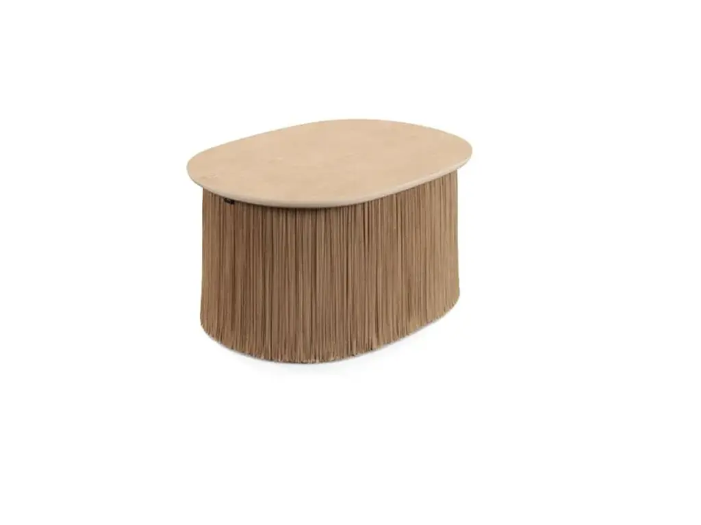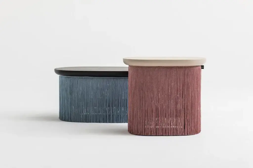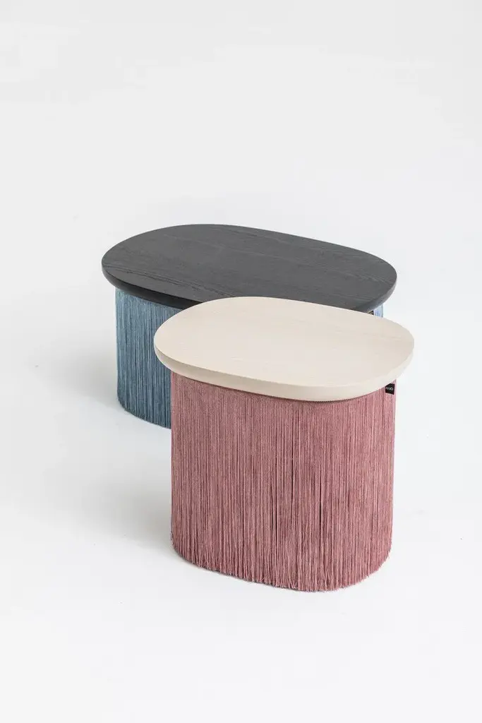 Coffee table, lower and wider, and Side table, intended as a logical continuation of the armrest of the sofa, Meduse is an ideal table top. Designed to have a dual nature, it does not takes up too much space in the living area and gives all its practicality as a container for small objects; objects that one prefers to have at hand, but covered, thanks to the dress made by means of textile fringes.Top: ash veneer fiberboard top in natural and charcoal finish. Frame: solid beech wood lacquered black. Shelf: wood particle board laminated and edged black. Fringes: 100% ac.From the creative vision of Liu Jo was born the custom-made living room. Craftsmanship, versatility, style and sustainability come together to enter the world of home and transform the furniture. Liujo’s living collection is a declaration of intent: new forms and customizable materials open the space to new reading keys and give life to unique pieces. The house is dressed and changed to meet all the needs of everyday life detaching from the classic nomenclatures and running on elegant lines, delicate finishes, soft fabrics and customizable colors. Not only sofas, poufs or armchairs, but design with a strong identity, free, sectional and removable, with irregular and fresh shapes that revolutionize the environment. Recognizable and iconographic in ideas, shape and finish, the pieces of furniture by Liu Jo find their reason for being in contrast: structures and rigid elements are designed to contain and embrace curves and movements, enhancing personal style and easily changing position and function.