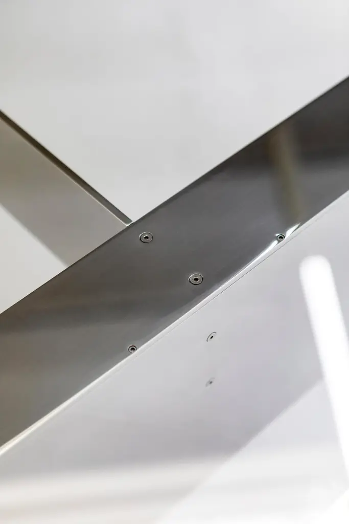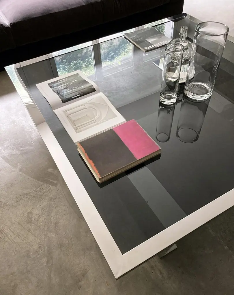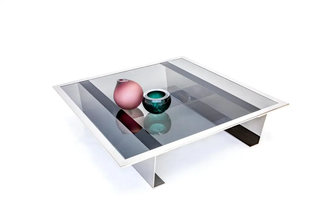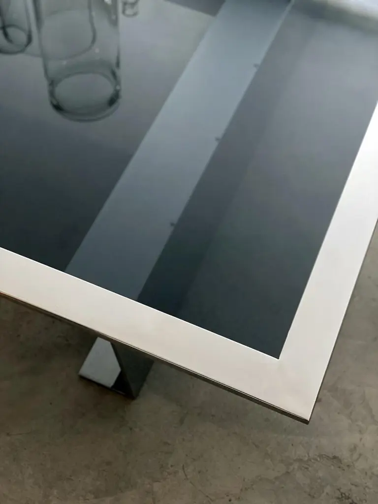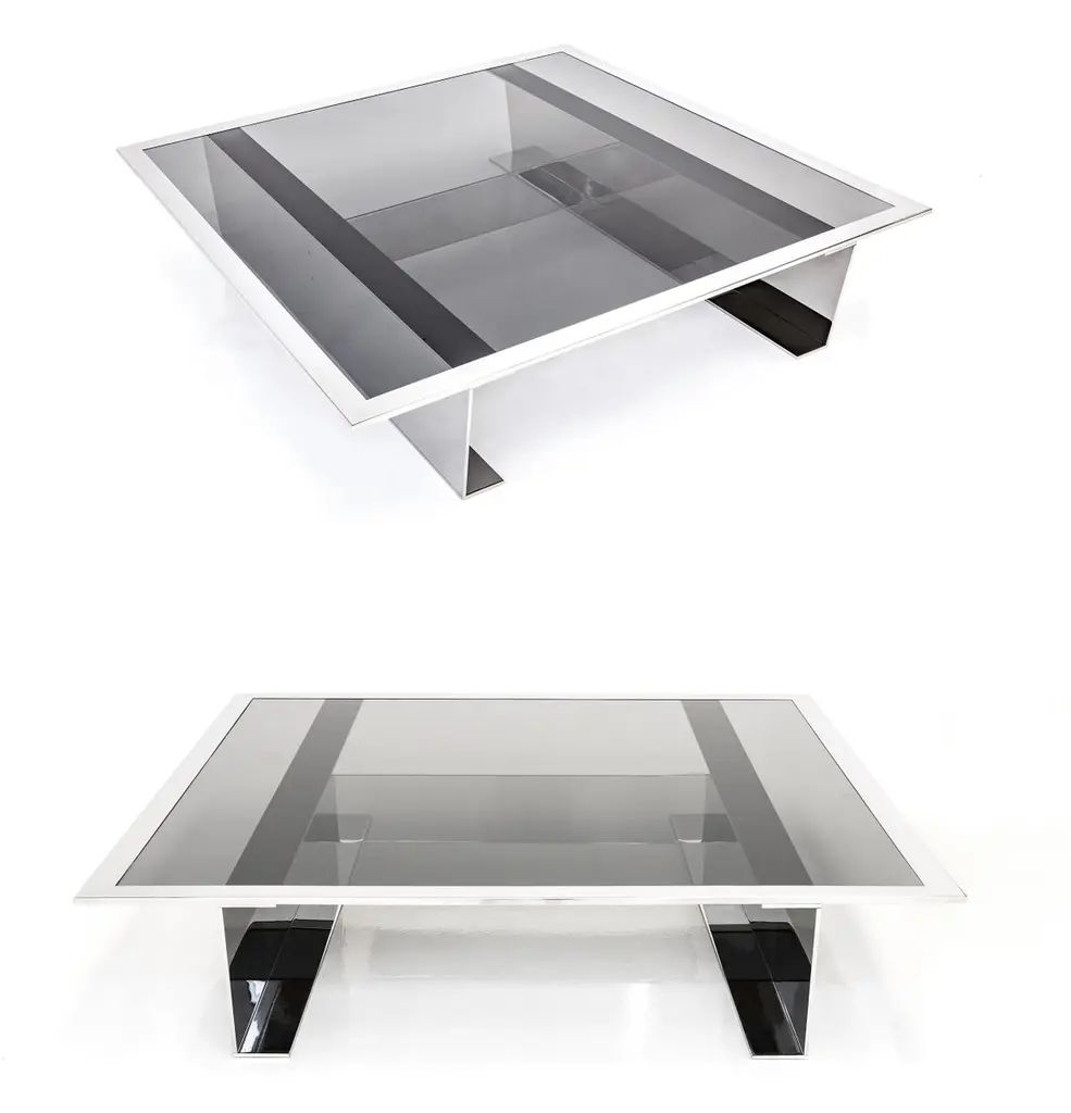 A clear H-shaped architectural structure of steel blades supports a large, framed glass plane. The conceptual cleanliness and the minimal lines of the design reveal a very high precision execution: the laser cutting of the blades and their assembly with visible screws give the piece the quality of a “jewel” of great refinement and manufacturing complexity, made possible thanks to the virtuosity of our craftspeople. The chrome finishes - gold, silver, and black chrome - help to create the suggestive play of trompe-l’oeil reflections that gives visual lightness to the important dimensions of the piece. We propose it here in the 150x150 cm version but it’s also available as 190x100. The Mega, like all pieces by Casa Casati, can also be made to measure according to the customer's requests. As for the finishes, the metal parts of this coffee table can be: matt black, black nickel, gold chrome, silver chrome. The top of the Mega is available in Fumé, Bronze or Stopsol glass.This price is for a chrome version, 150 x 150. available now.