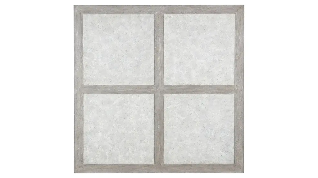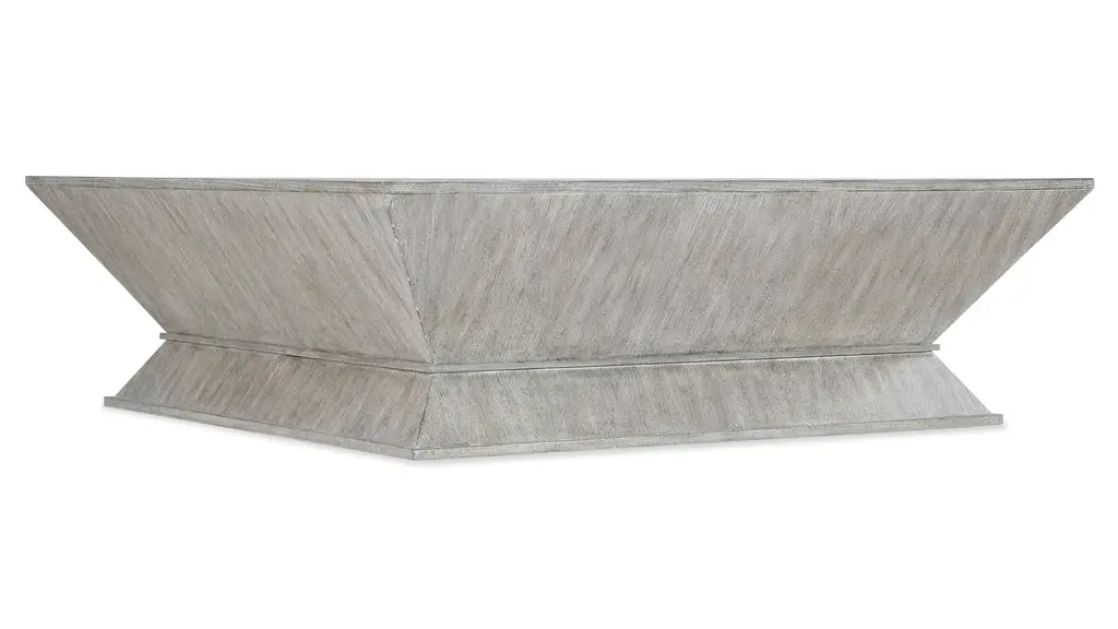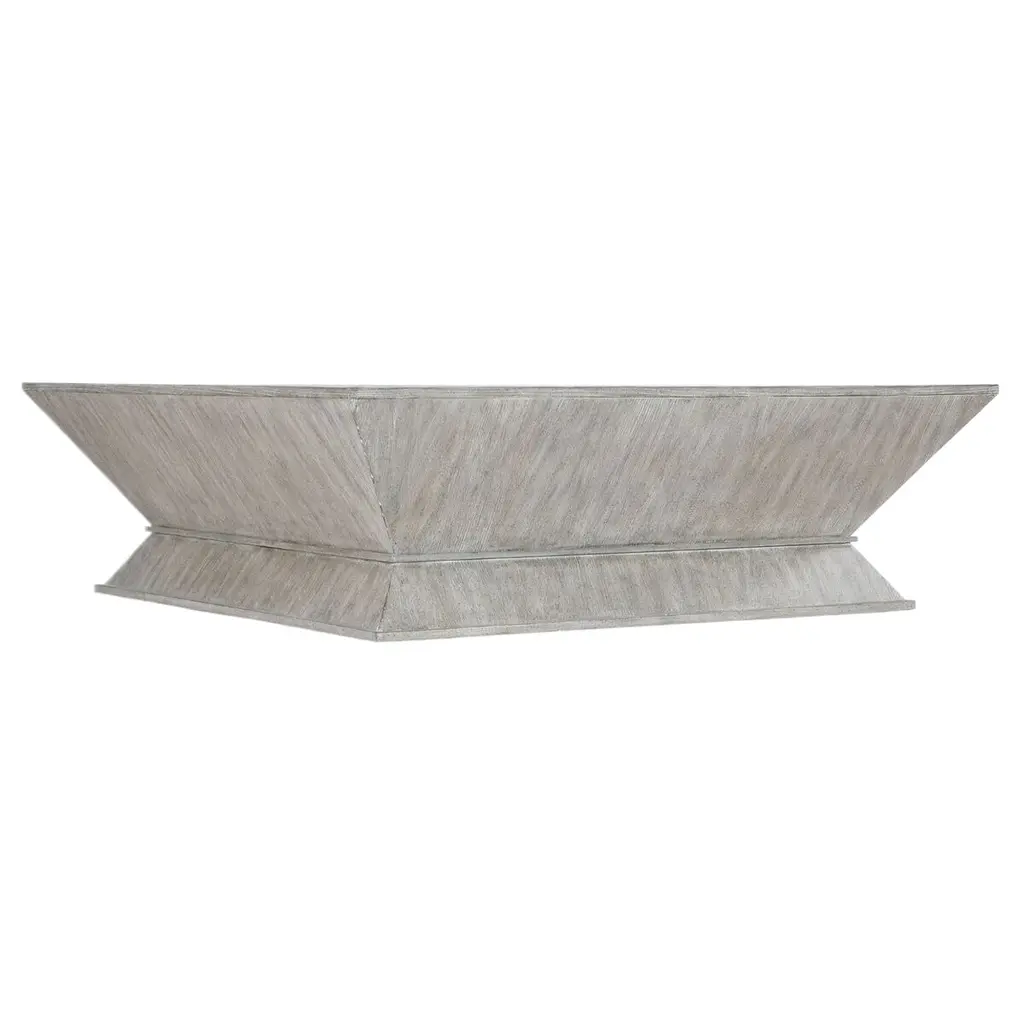 With a chic chunky shape and four paned stone-like panels on the top, the Melange Cocktail Table has a casual organic look with a serene gray finish over Elm Veneers and resin.