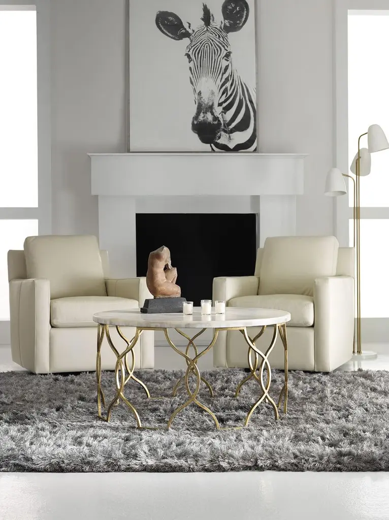 Light and airy, sleek and chic, the Corrina Cocktail Table is distinguished by a delicate fretwork metal base topped by a round top of organic elegance.