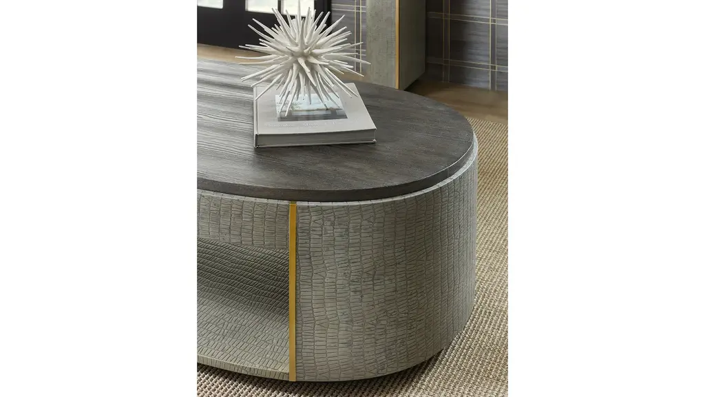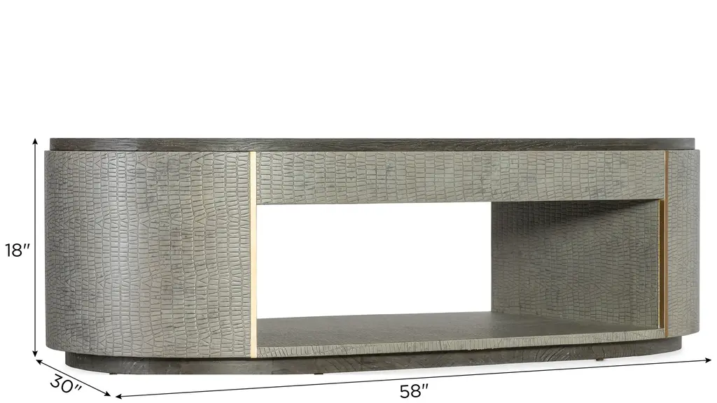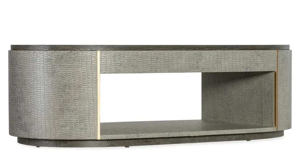 Melange Dylian Coffee Table has a gray crocodile exterior with gold metal accents and a dark wood top and base. Crafted of Pine Veneers and Robus Leather, it has an oval shape with an open shelf area.