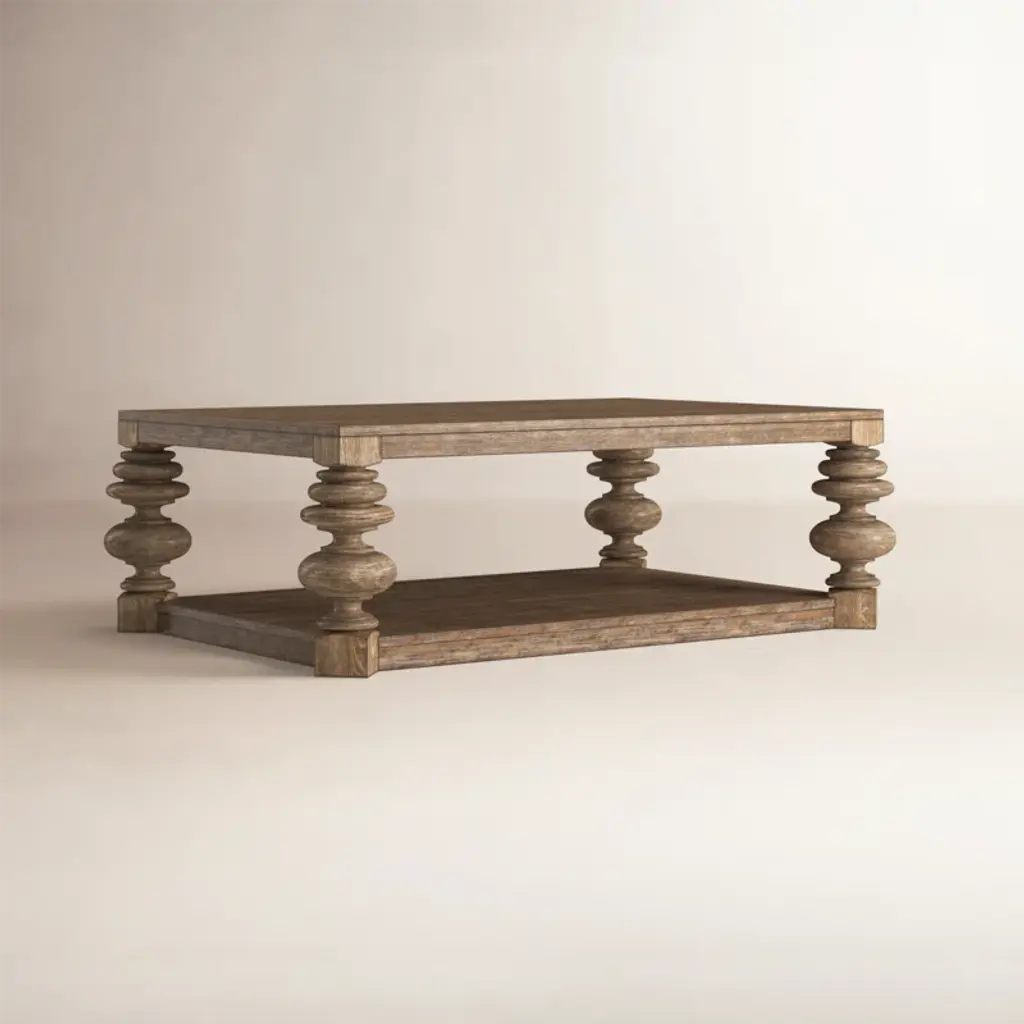 The 59.5-inch architrave rectangular cocktail table provides a striking centerpiece to any living area, as well as plenty of surface area for both relaxing and entertaining. Four dramatic columns support the table, representing an exaggerated version of 18th-century neoclassical columns, bringing historical style into the 21st century with contemporary boldness. Wire-brushed pine is hand-glazed in a warm almond-toned finish, allowing the beautiful wood grain a chance to shine, and representing a balance of old-world formality with laidback modern charm.