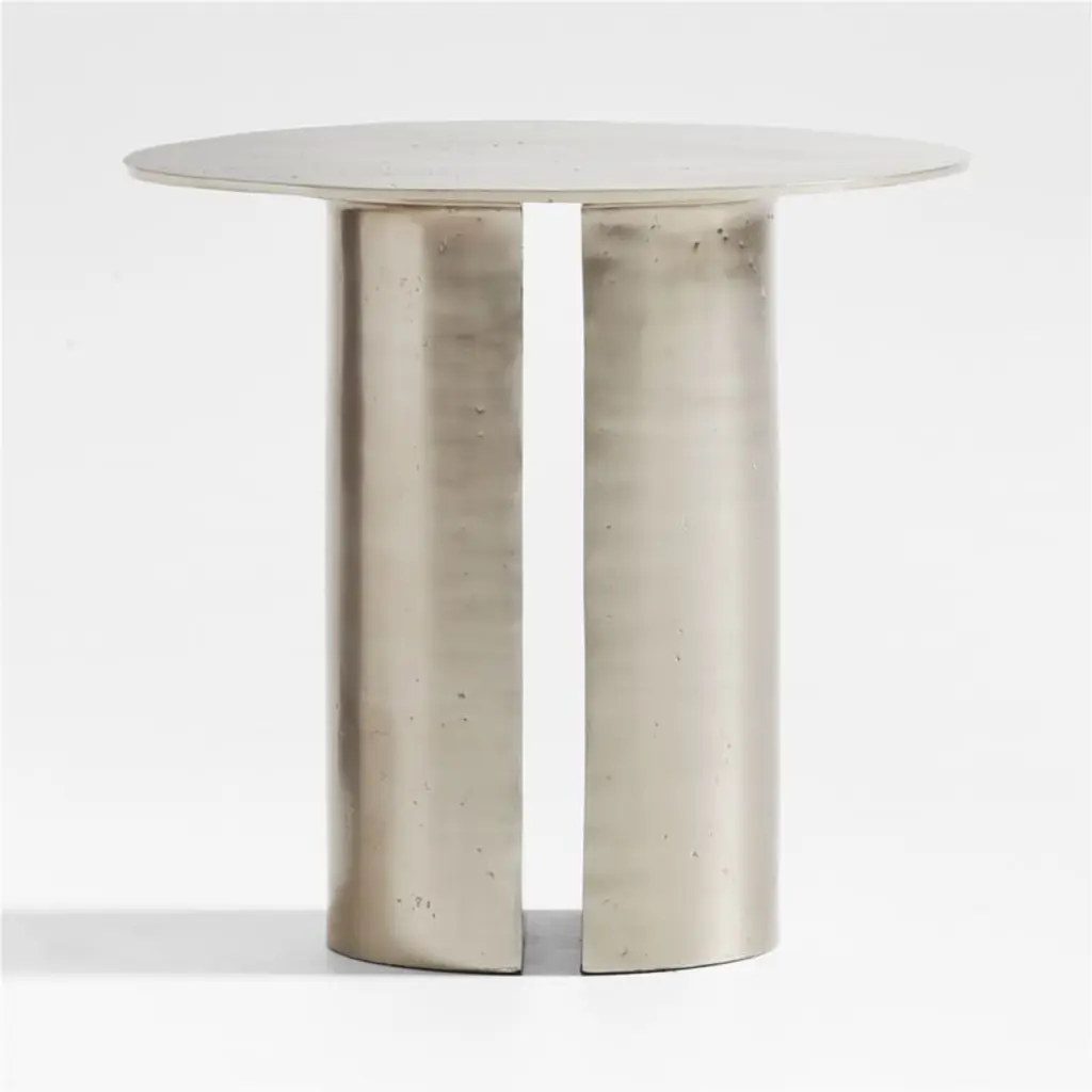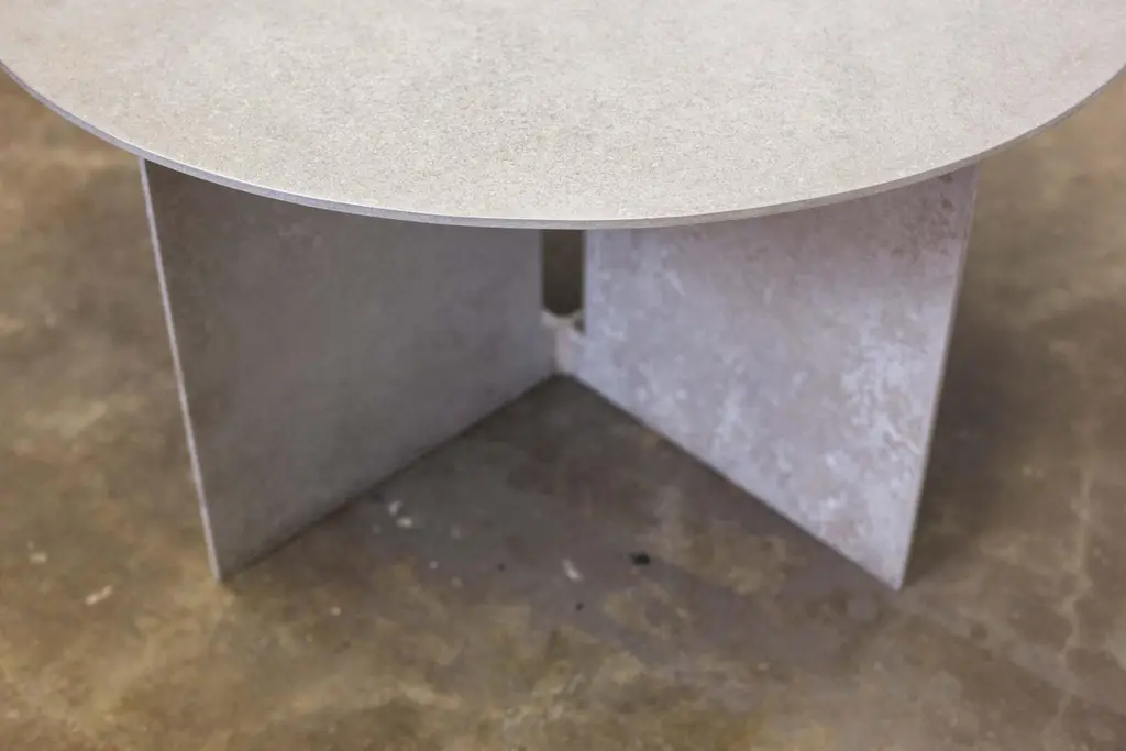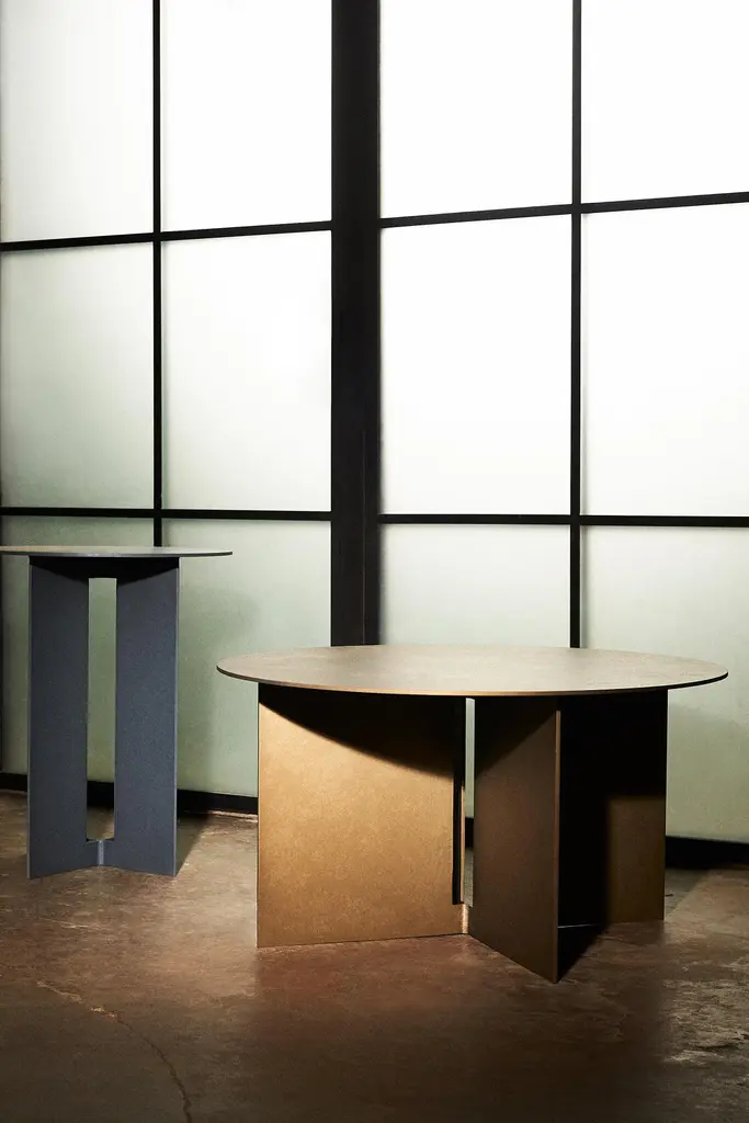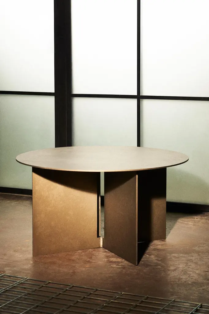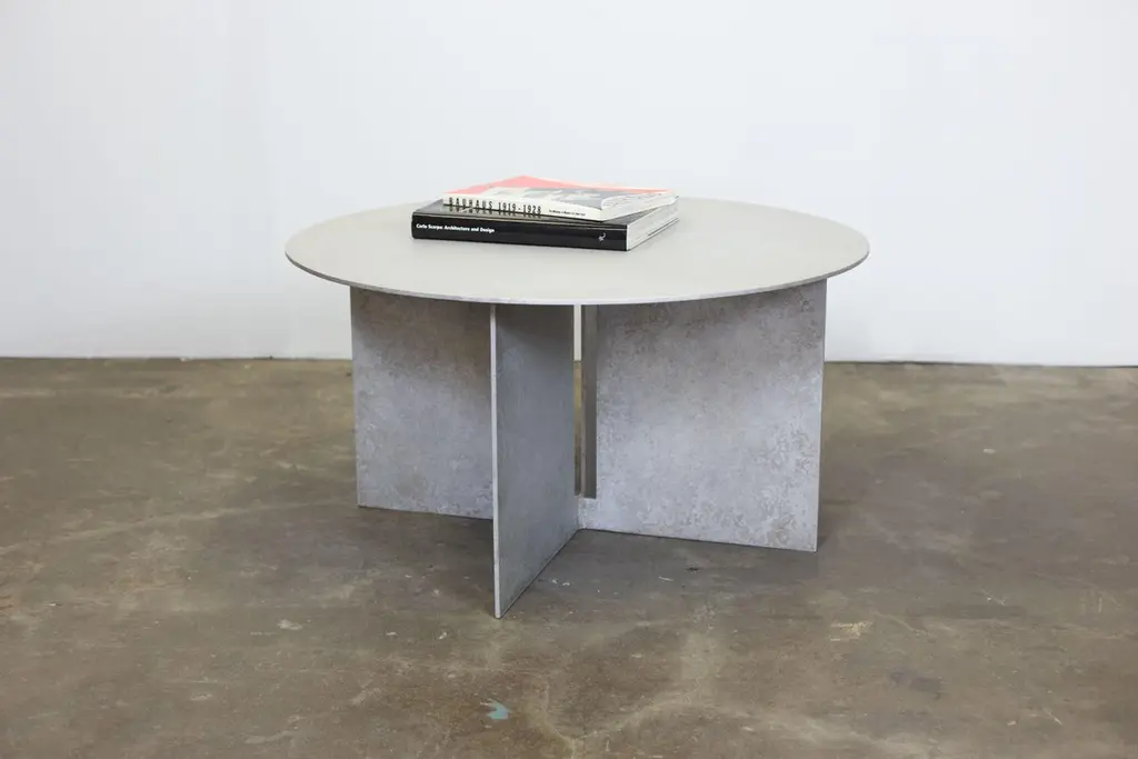 The Mers coffee table is fabricated from solid aluminum and is suitable for use indoors and out. Form is inspired by the simple utilitarianism of West Coast aluminum fishing boats.Shown in aluminum with salt pack finish.Overall dimensions: 36"D x 16" T.All new format pieces are handmade in Vancouver, Canada.