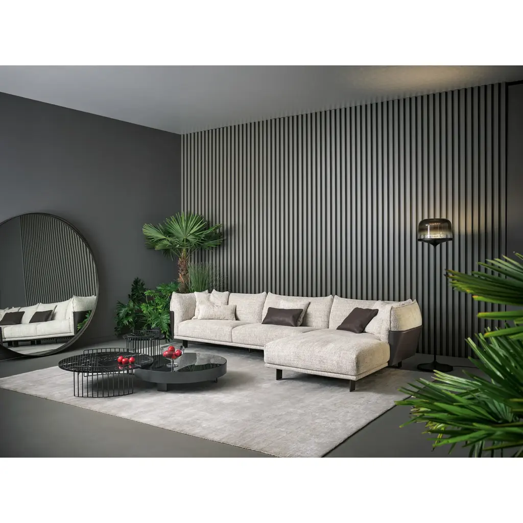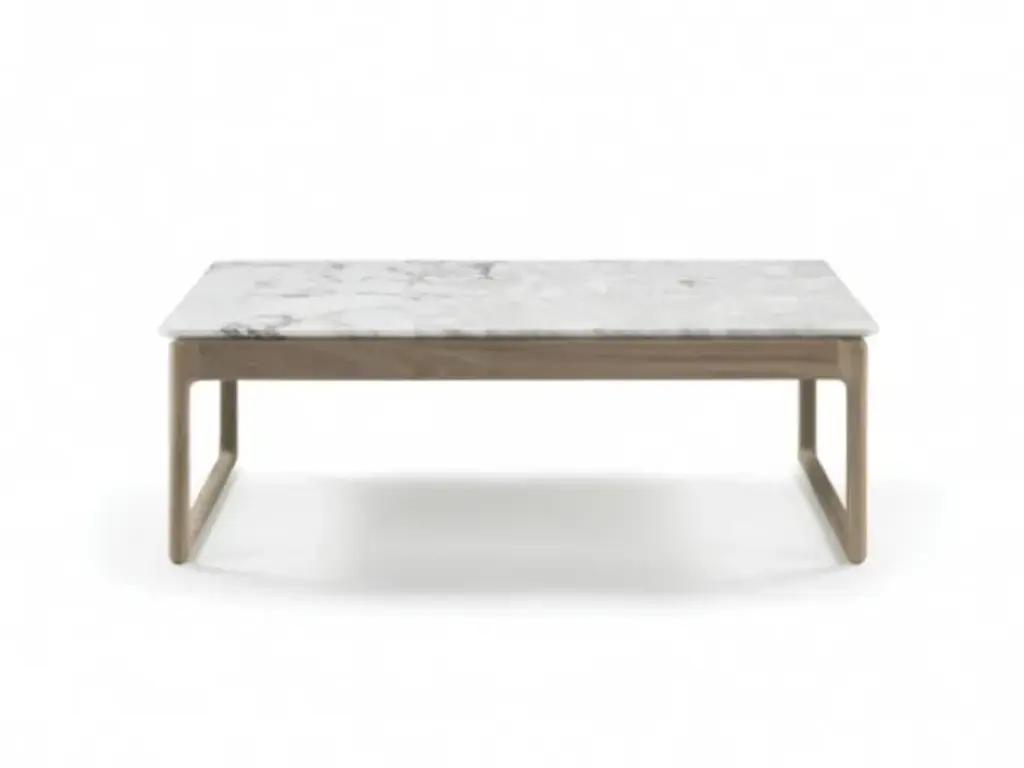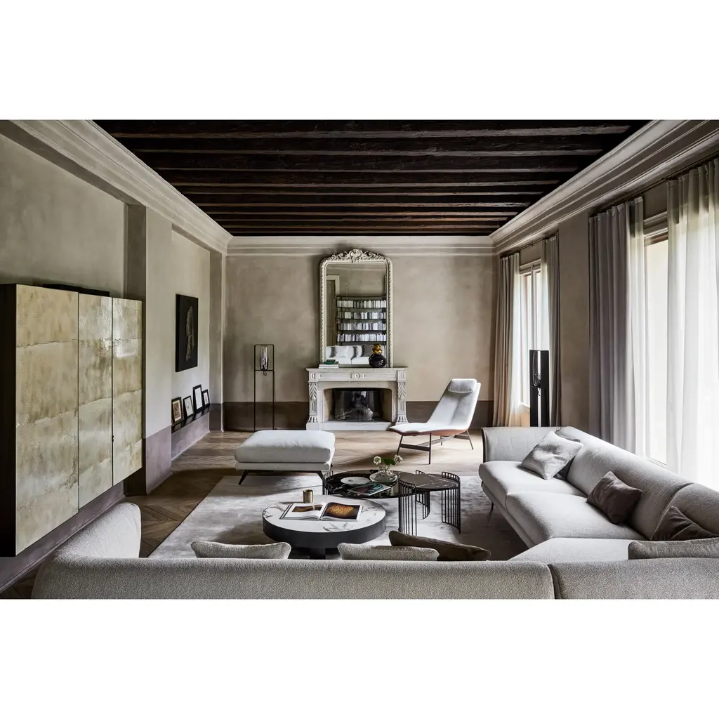 The Jazz low coffee tables feature a formal linear design, which comes in a rectangular or round version. They have a spacious surface area that showcases the typical decorative objects featured in living rooms. Jazz modern low coffee tables are almost at floor level, slightly raised on metal feet with a highly geometric shape. The imposing tabletop, available in glass or ceramic, is bordered by a metal edge which contrasts with the almost invisible base.