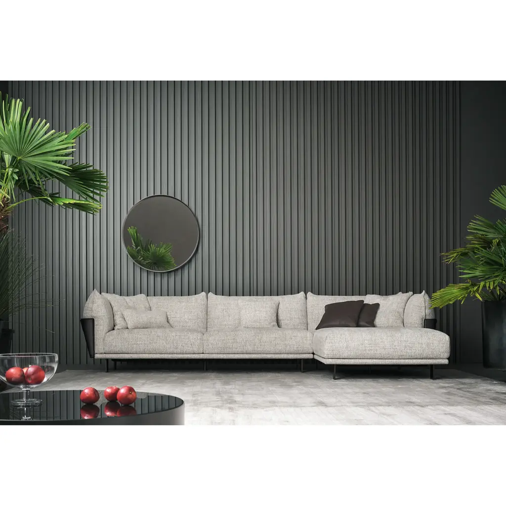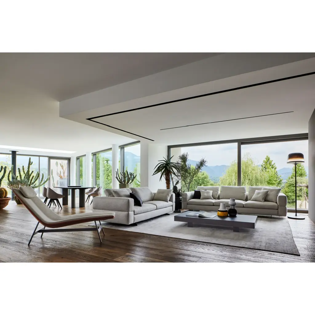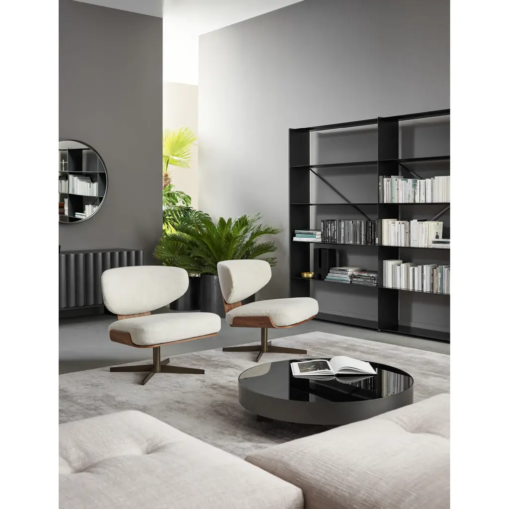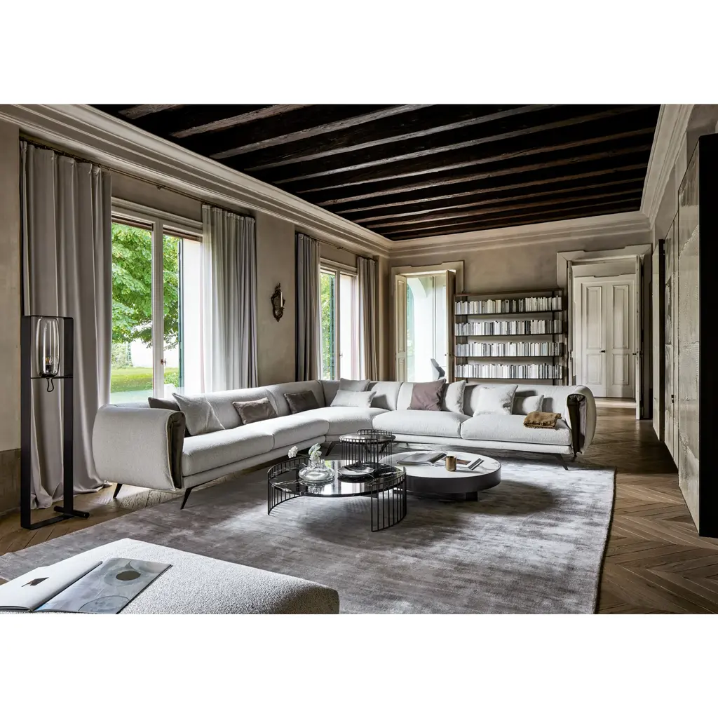 The Jazz low coffee tables feature a formal linear design, which comes in a rectangular or round version. They have a spacious surface area that showcases the typical decorative objects featured in living rooms. Jazz modern low coffee tables are almost at floor level, slightly raised on metal feet with a highly geometric shape. The imposing tabletop, available in glass or ceramic, is bordered by a metal edge which contrasts with the almost invisible base.