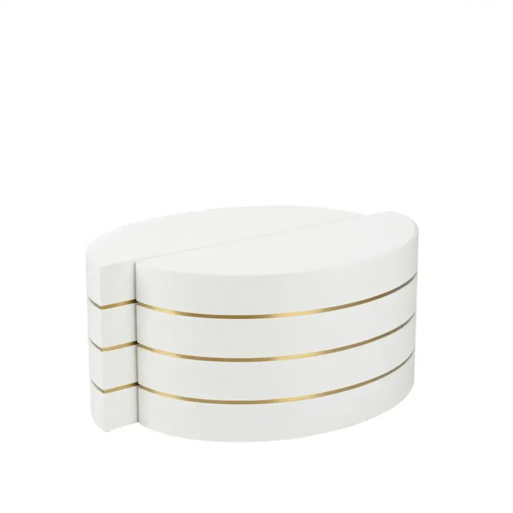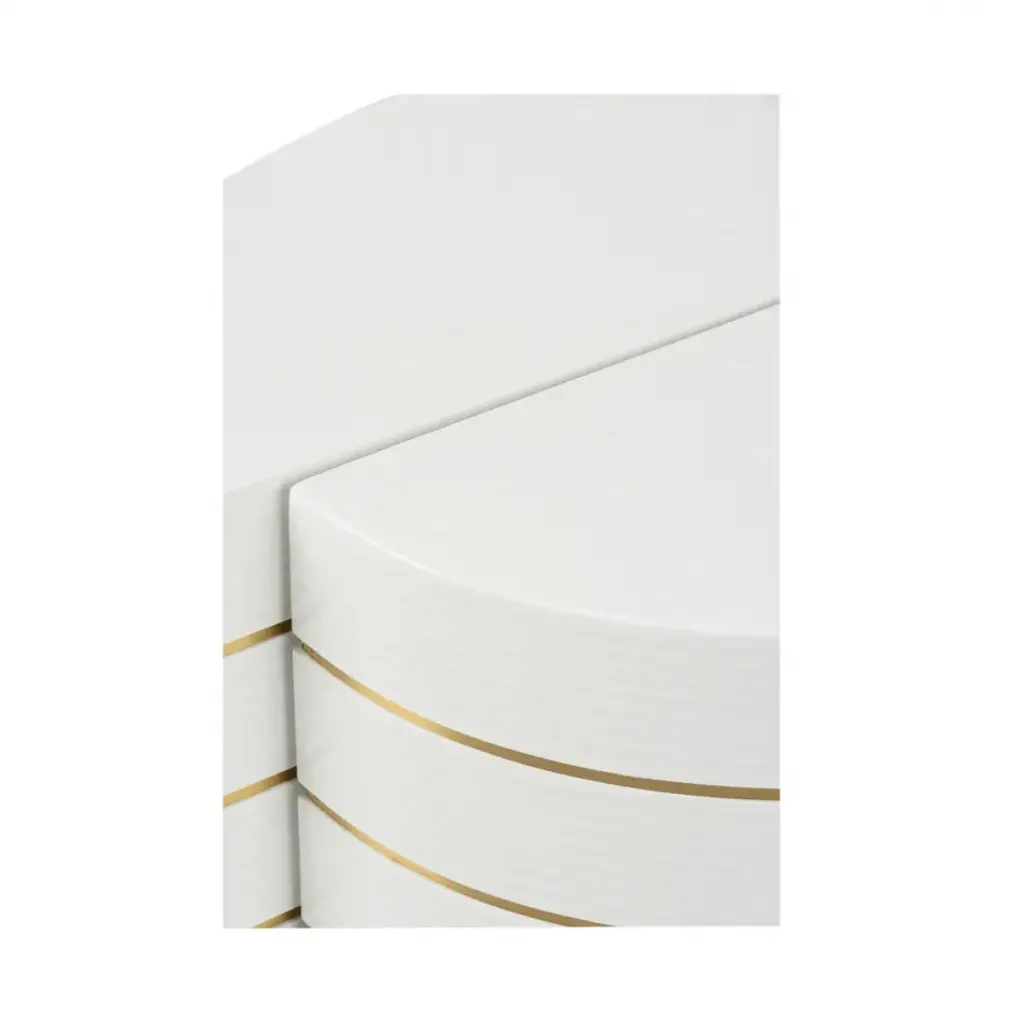 Bring a bold look with our Mezzaluna Bunching Tables. Captivating white lacquered textured weave paneling is finished off with antique brass sheet metal banding. The set of two are a perfect companion next to a sofa or chair or paired together as a cocktail table. Designed by Elizabeth Wicker.
