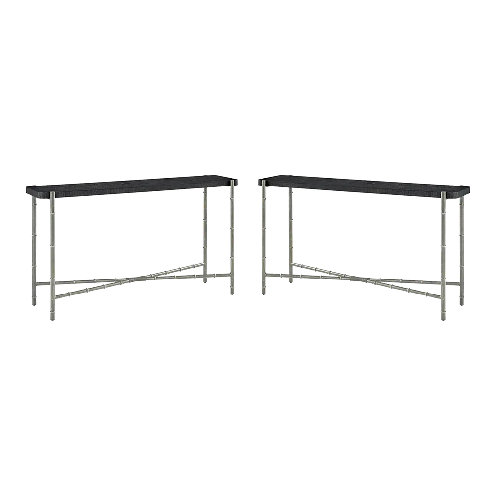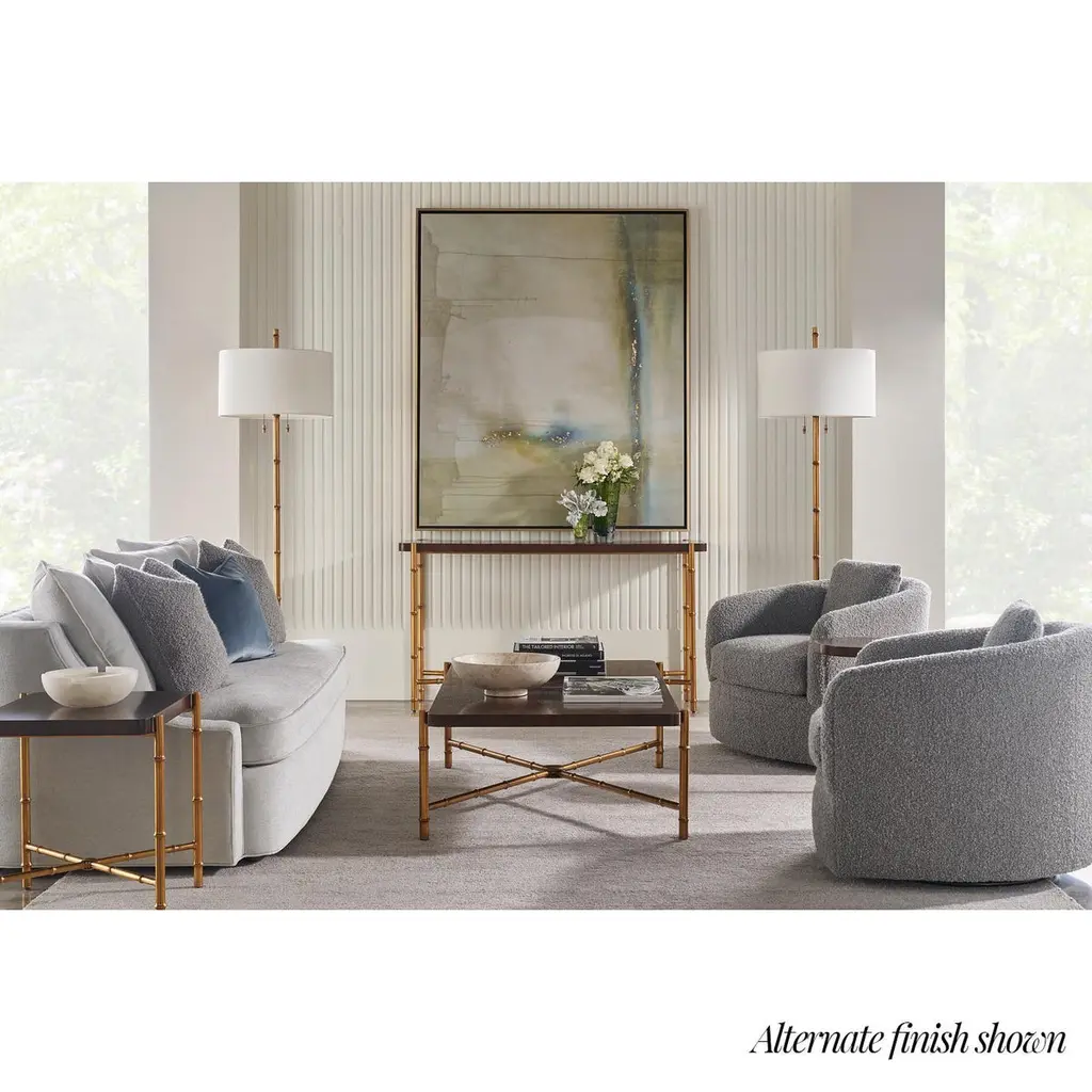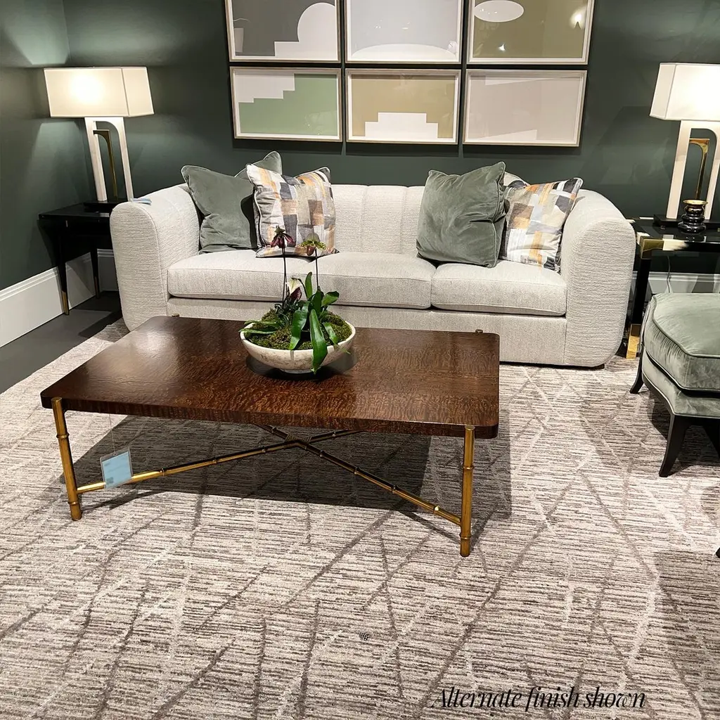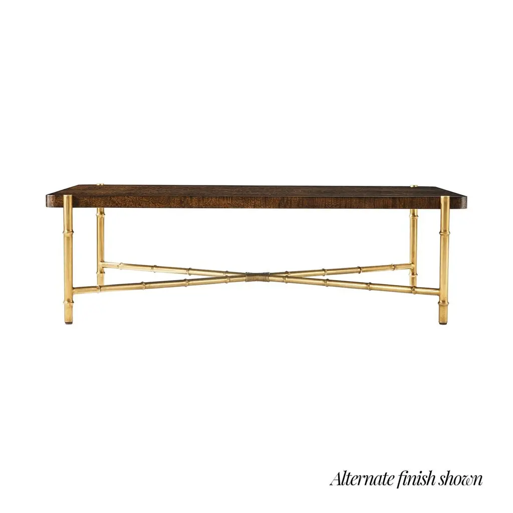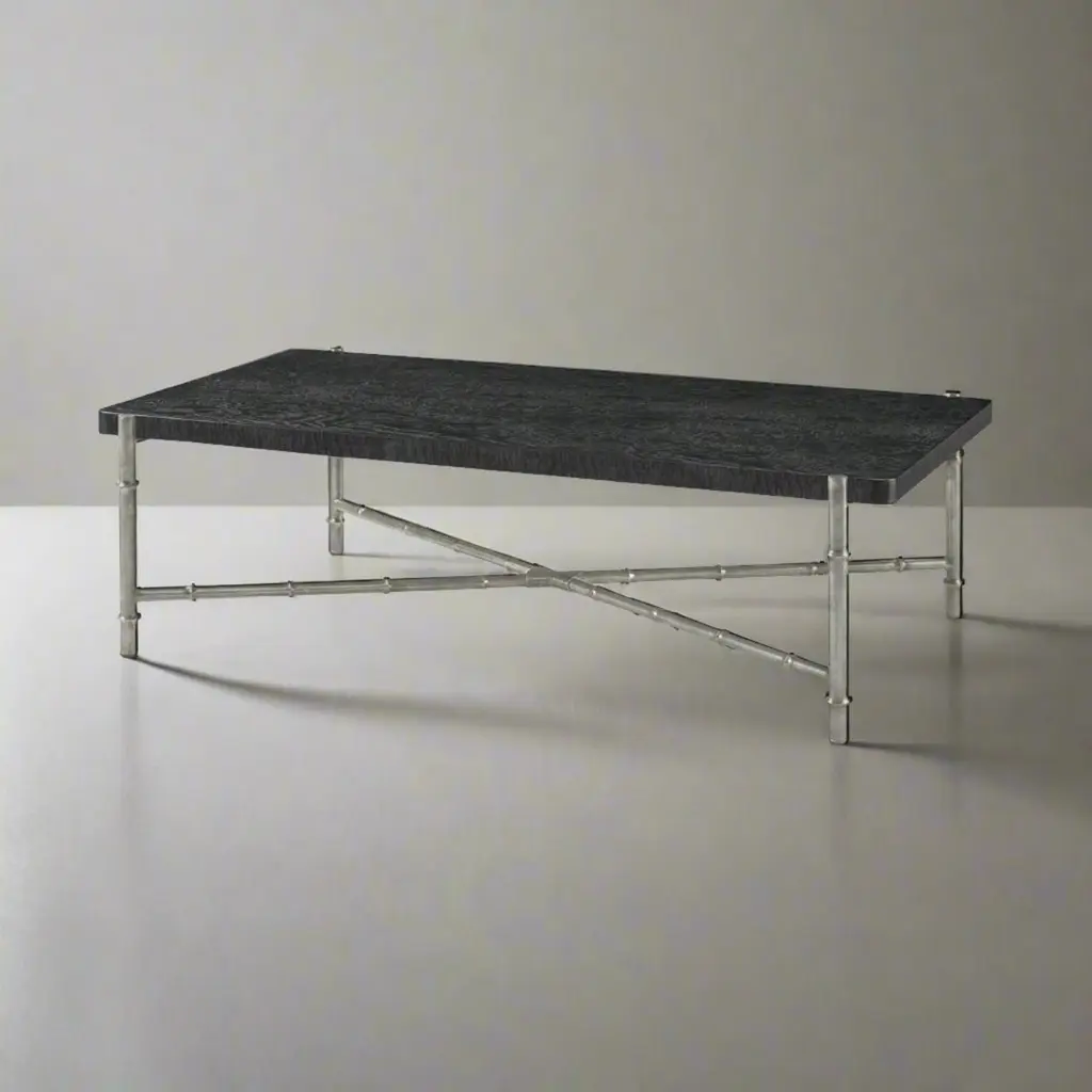 Slender lines form a light and airy design in the modern coffee table. A graceful combination of Tamo ash wood in a dark silent black finish atop an organic faux bois base.Dimensions: 55" W x 34.5" D x 16.5" H