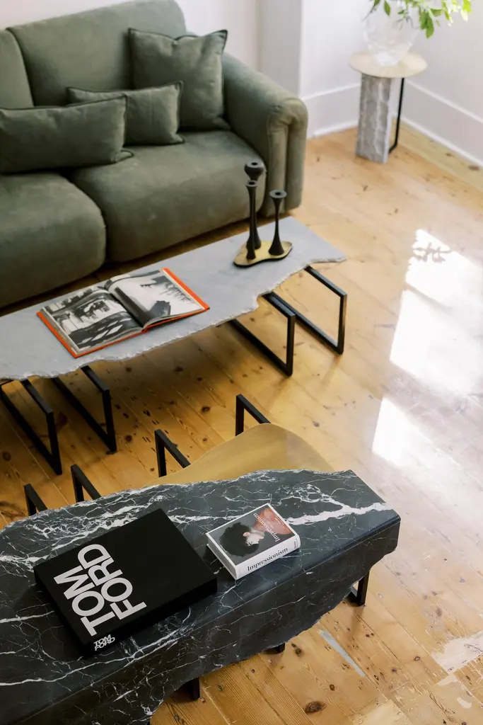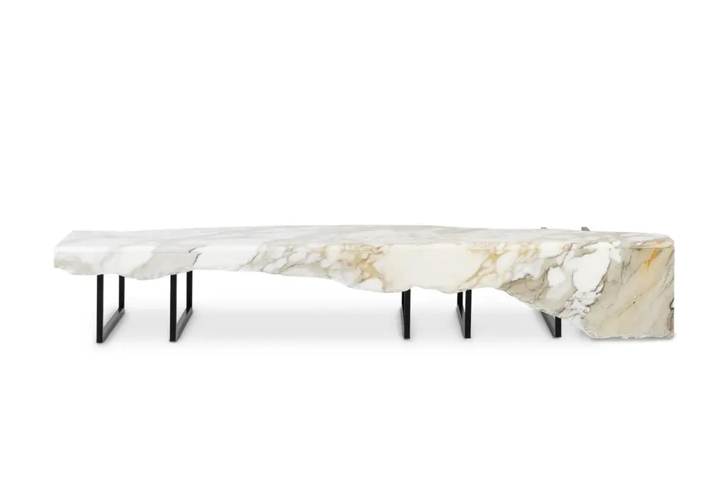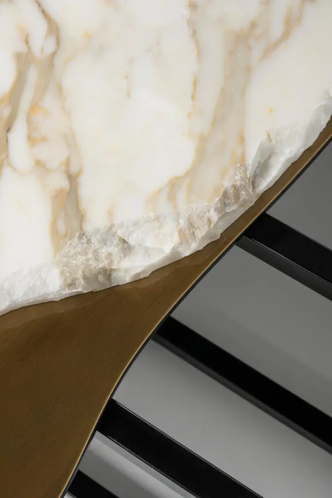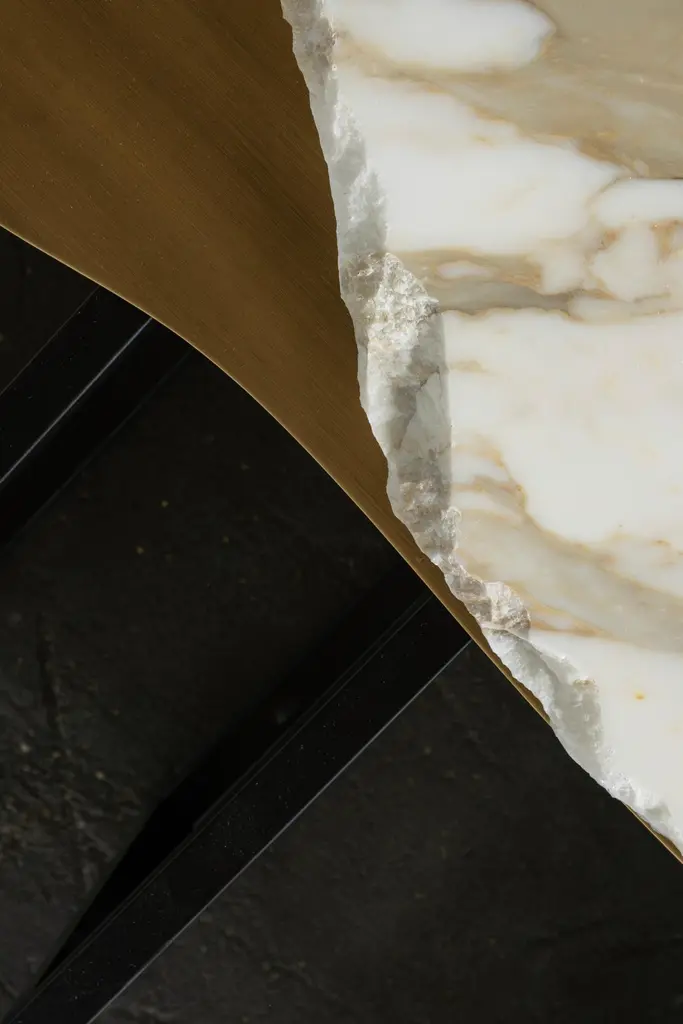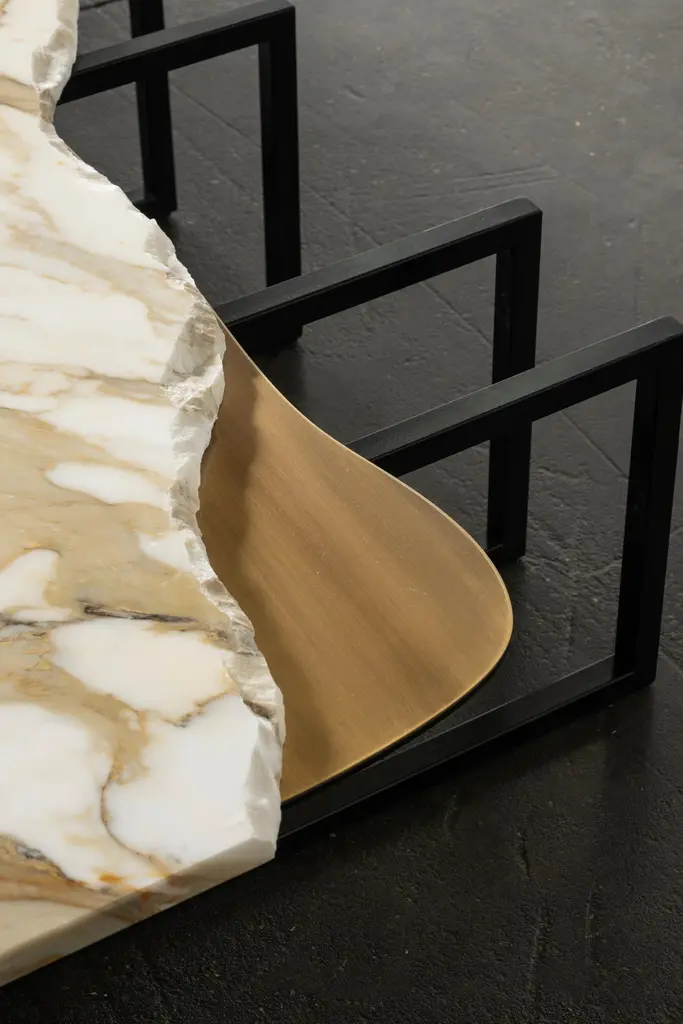 Mid-Century Modern Aire Coffee Table, Contemporary Collection, Handcrafted in Portugal - Europe by Greenapple.The Aire marble coffee table stands out as a bold expression of modern sophistication. Inspired by the captivating Grutas de Mira de Aire, its irregular design echoes the organic beauty of nature's creations. The asymmetry of the marble top, featuring dramatic veining, contrasts beautifully with the sleek metal frame and brass detail, creating a striking interplay of textures. Crafted with exquisite materials and meticulous attention to detail, the Aire marble coffee table is a statement centerpiece designed to elevate contemporary interiors.The Aire coffee table features a metal structure lacquered in satin black with top in brushed and burnished antique brass with a high-gloss varnish. Top and side detail is crafted from polished Calacatta Oro marble, in cream and gold tones, showcasing a split-face effect on the edge.The Aire coffee table can be customized in terms of dimensions, materials and finishes.Aire Coffee Table Material CodesFI007 Lacquered, Black, SatinST077 Calacatta Oro Marble, Polished, Cream-Gold, GlossME007 Brass, Brushed, Burnished, Varnished, Antique-Brass, High-GlossHandcrafted in Portugal - Europe by GreenappleUnique by design, Crafted by peopleGreenapple transforms contemporary spaces into exclusive narratives of design and craftsmanship. From custom-made furniture to bespoke interiors, each creation is a timeless work of art, shaped by master artisans who honor centuries-old techniques.Founded in 2005 by Sérgio Rebola and Rute Martins, Greenapple has earned global recognition among high-end clientele and leading design firms. While Rute designs each unique piece, Sérgio ensures uncompromising quality from design to production and from production to your home. We provide a seamless experience, offering short production lead times, worldwide delivery within 7 to 10 days, and white-glove service upon request.For U.S. clients, we can handle customs clearance, and offer white-glove service as well upon request.Cocktail Table, Center Table, Centre Table, Low Table, Tea Table