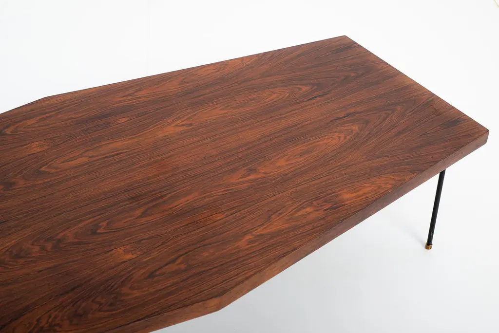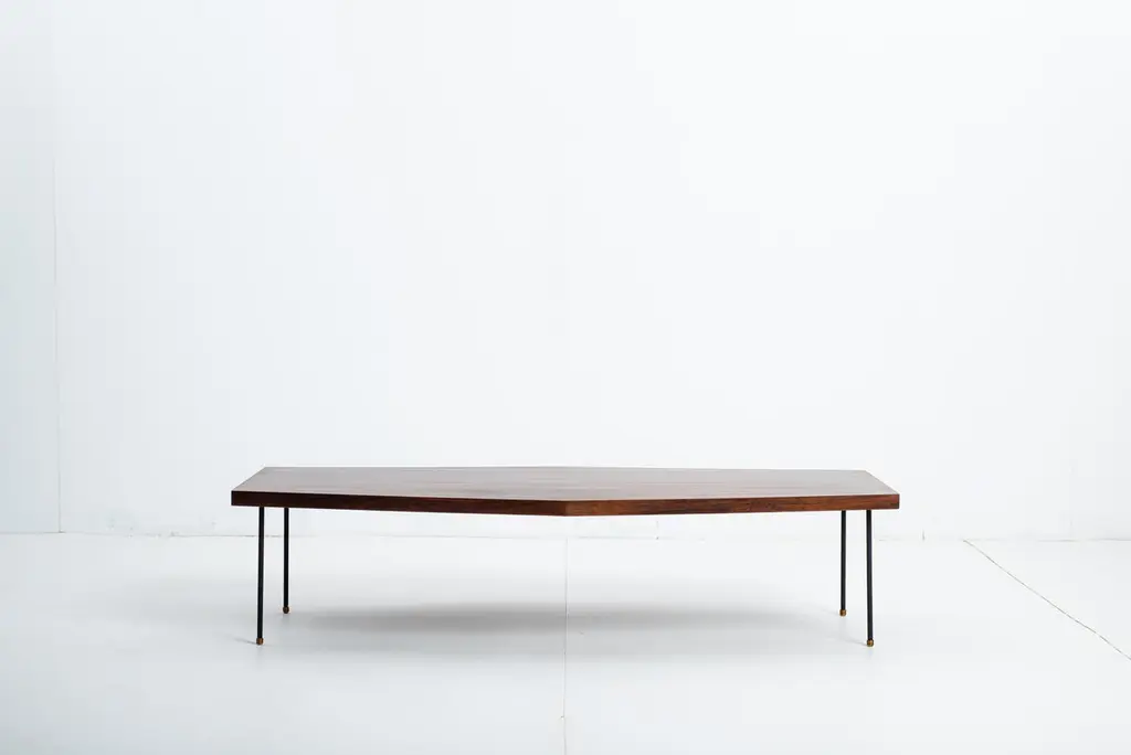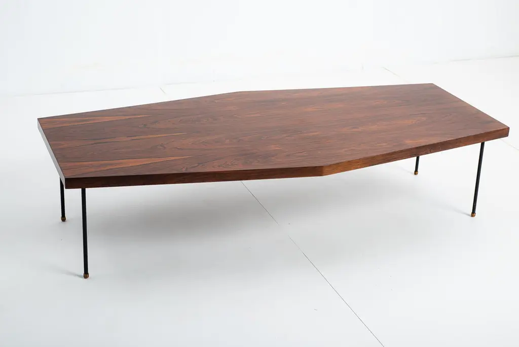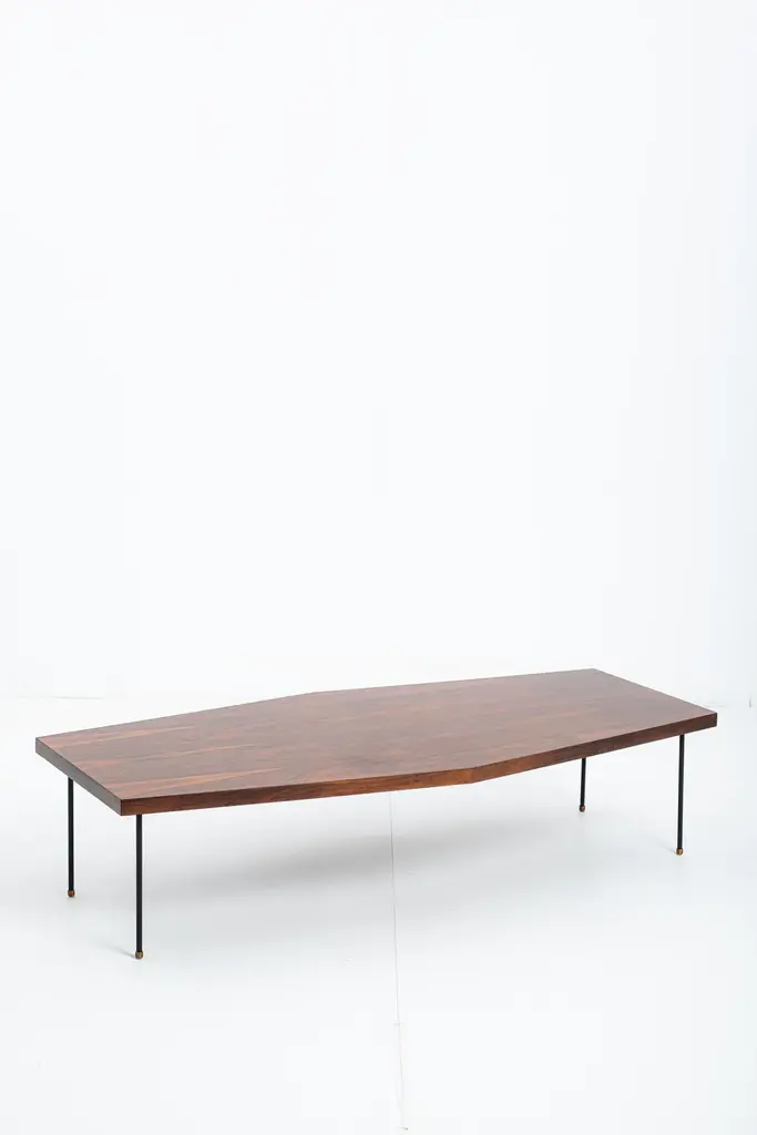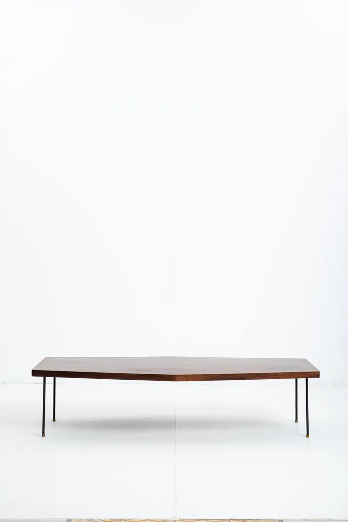 Mid-Century Modern Center Table by Brazilian Designer, 1960sCoffee table from the 1960s, by an unattributed Brazilian designer.It has a wooden top and is supported by slender iron legs with brass tips, adding a touch of elegance and lightness to the design. Its shape is distinctly geometric, with beveled edges that create a faceted, modern look.