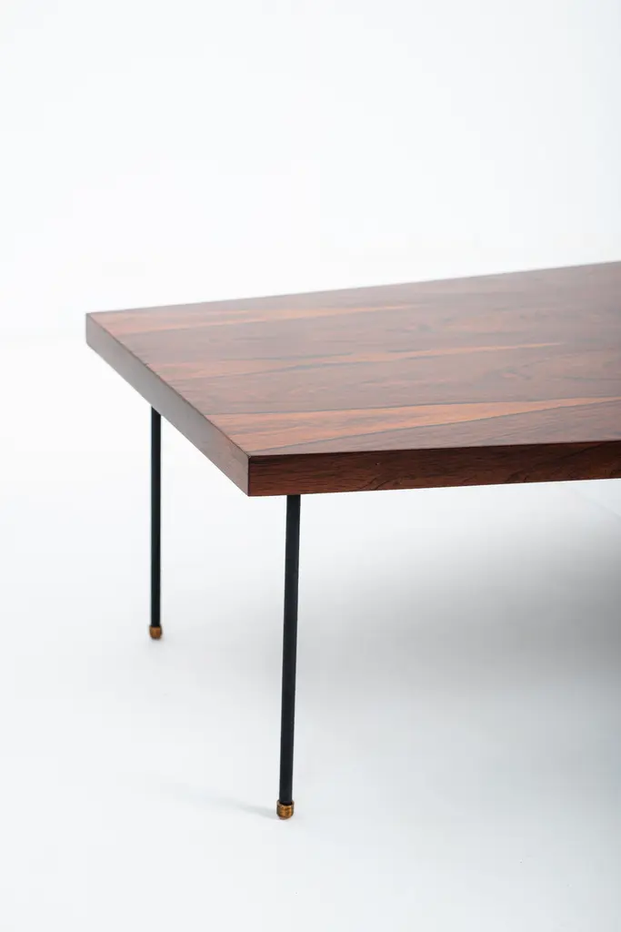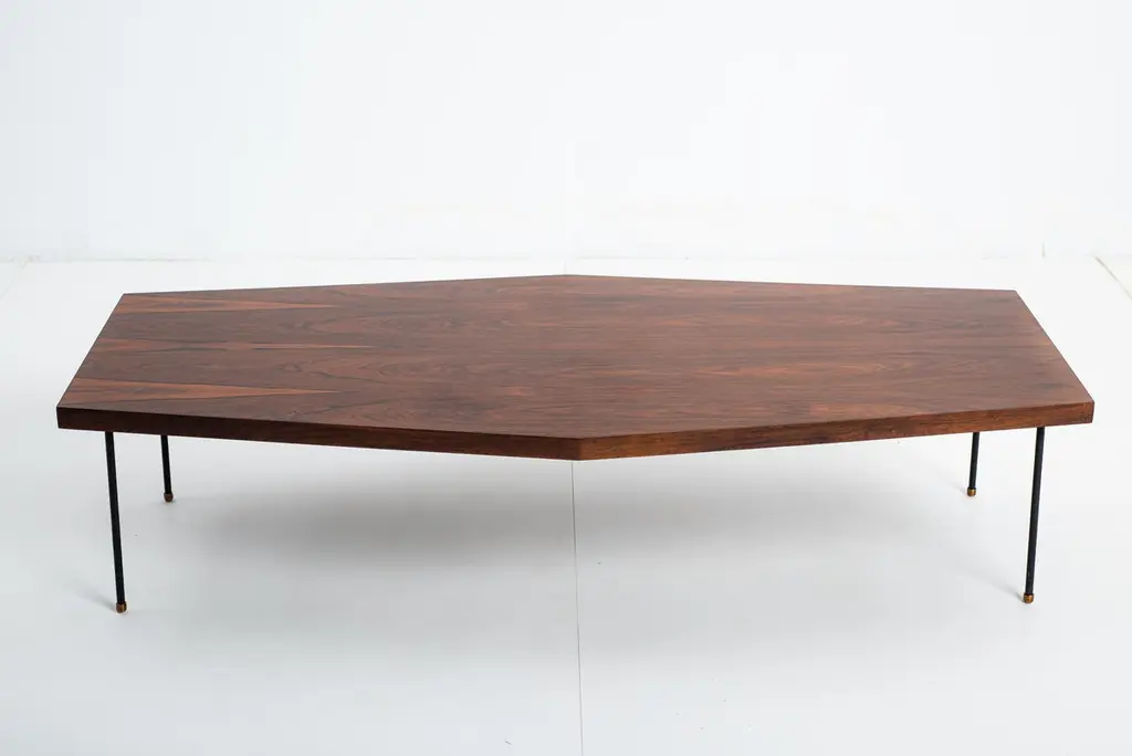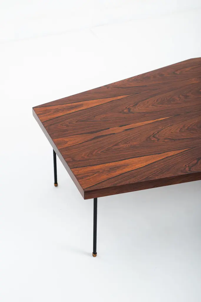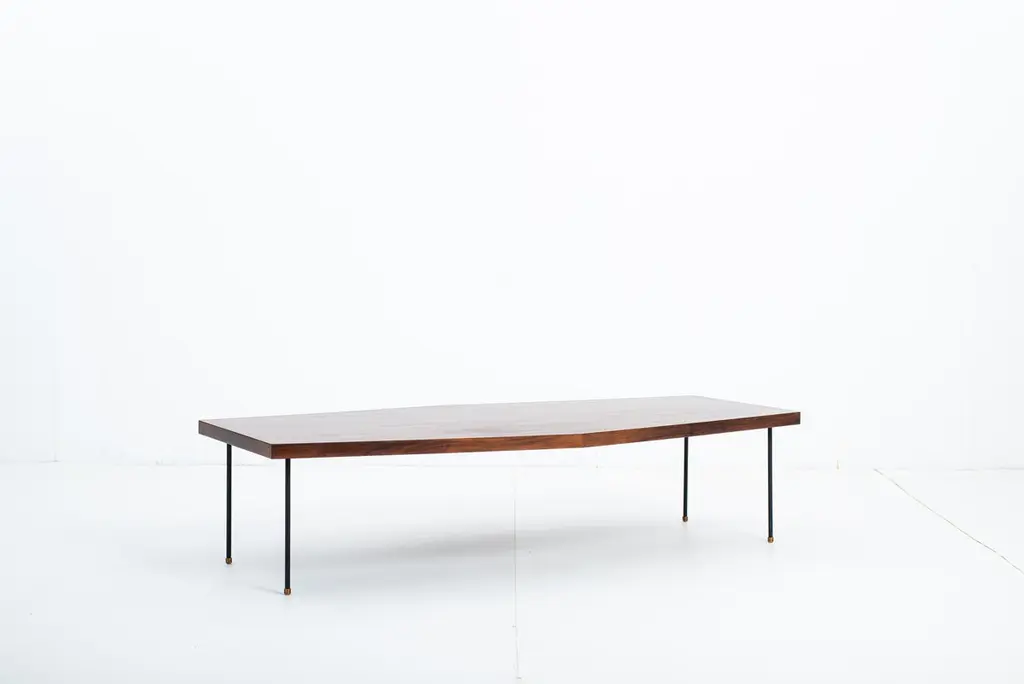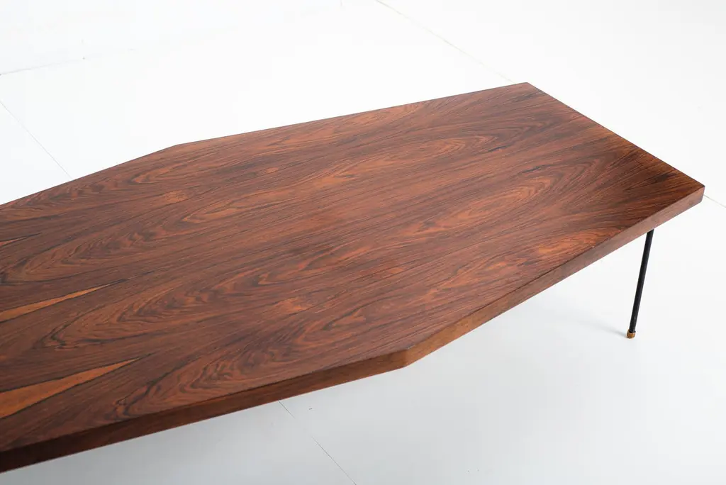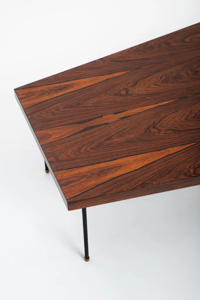 Mid-Century Modern Center Table by Brazilian Designer, 1960sCoffee table from the 1960s, by an unattributed Brazilian designer.It has a wooden top and is supported by slender iron legs with brass tips, adding a touch of elegance and lightness to the design. Its shape is distinctly geometric, with beveled edges that create a faceted, modern look.