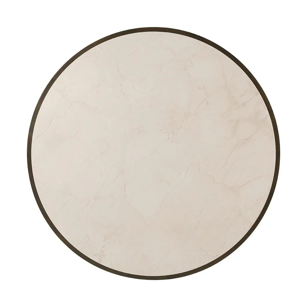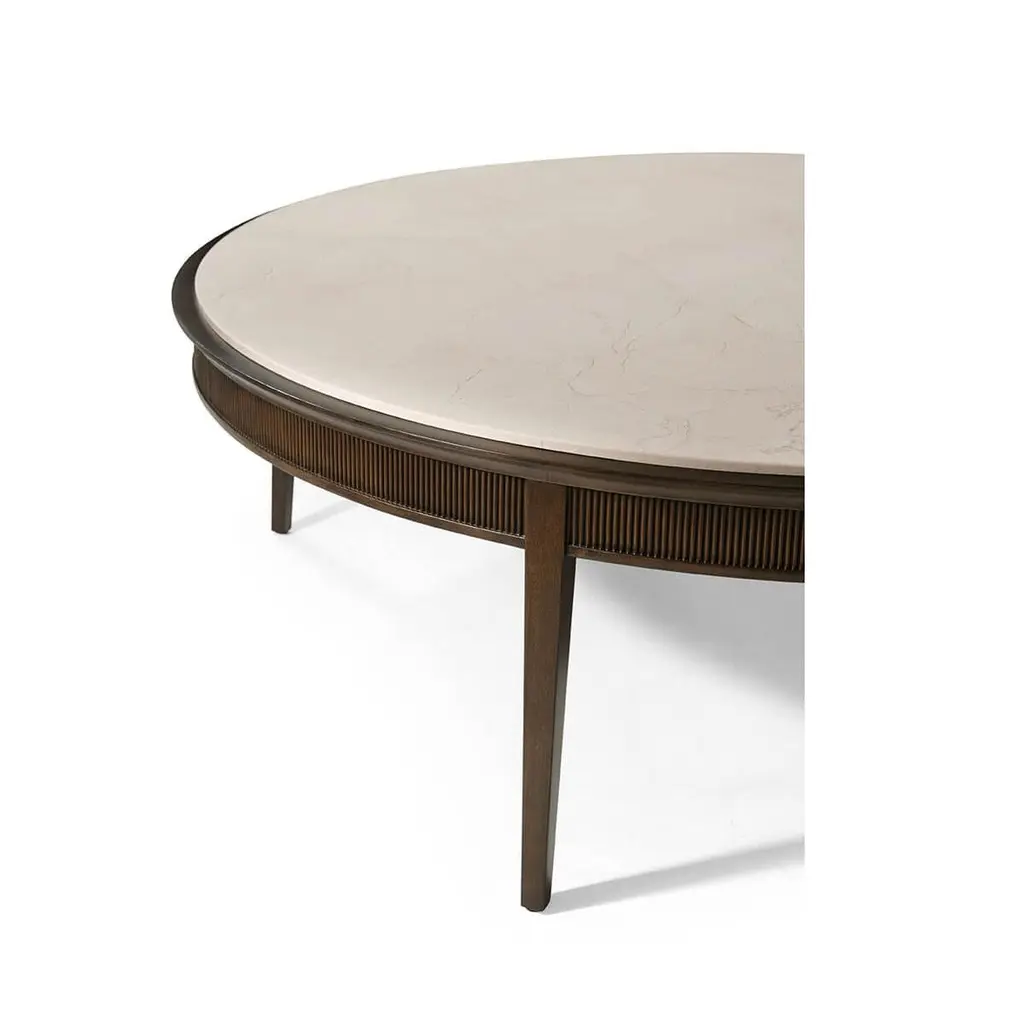 in our Bistre finish and complimented by a beautifully honed inset Crema Marfil marble stone top, features a sophisticated tapered silhouette and reeded carved details.Dimensions: 54.25" W x 54.25" D x 17.5" HMarble has natural variations and its figure may vary from piece to piece
