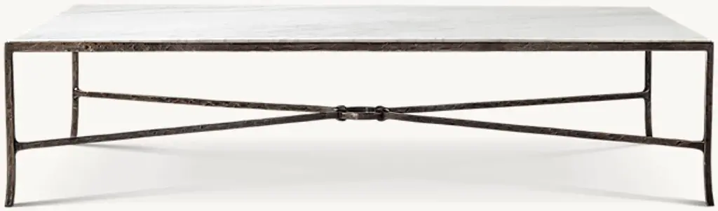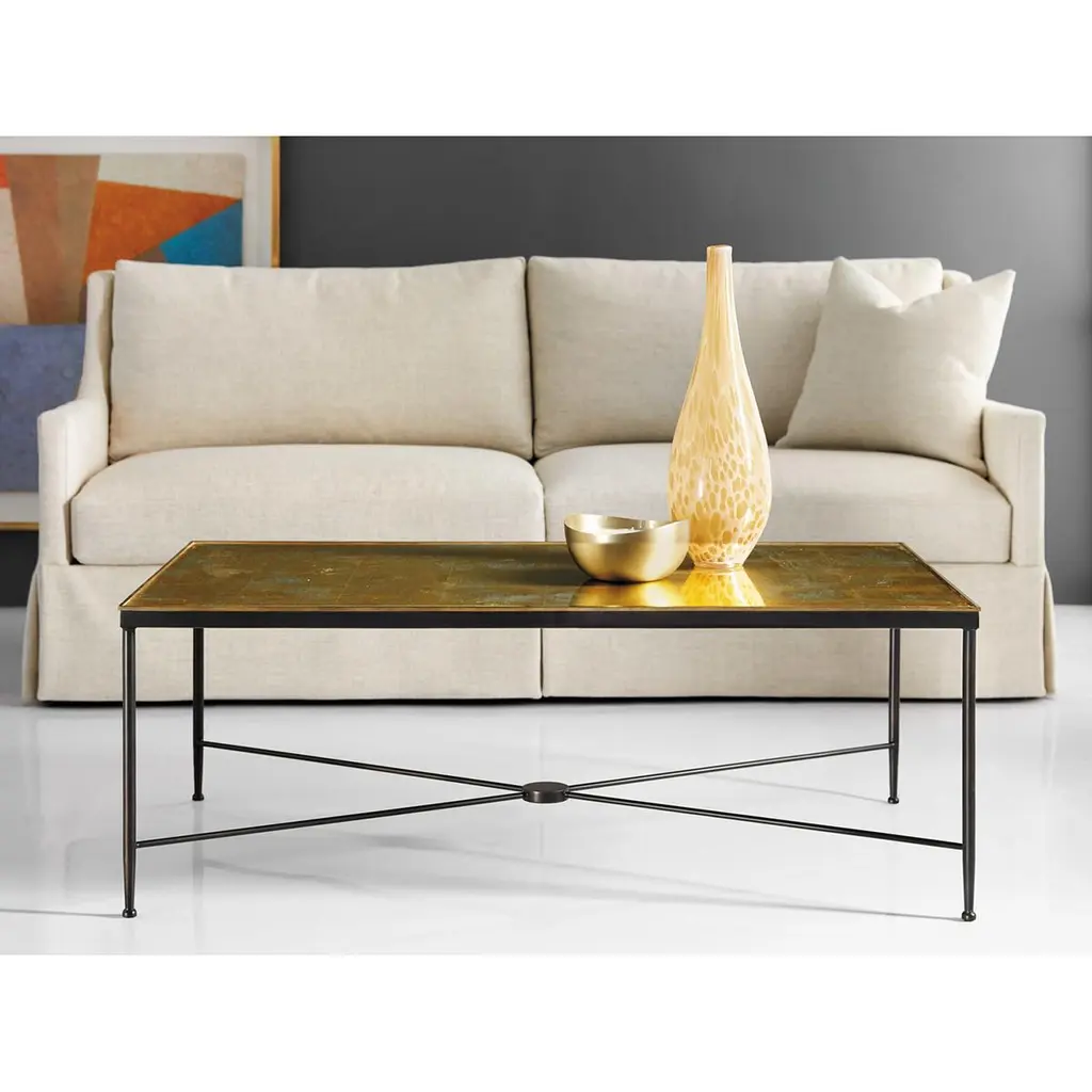 A midcentury Cocktail Table with Eglomisé Top with gold leaf etched details and a brass trim edge, above an ebonized wrought iron base with a X stretcher.Dimensions: 50 W x 30 D x 18 H.
