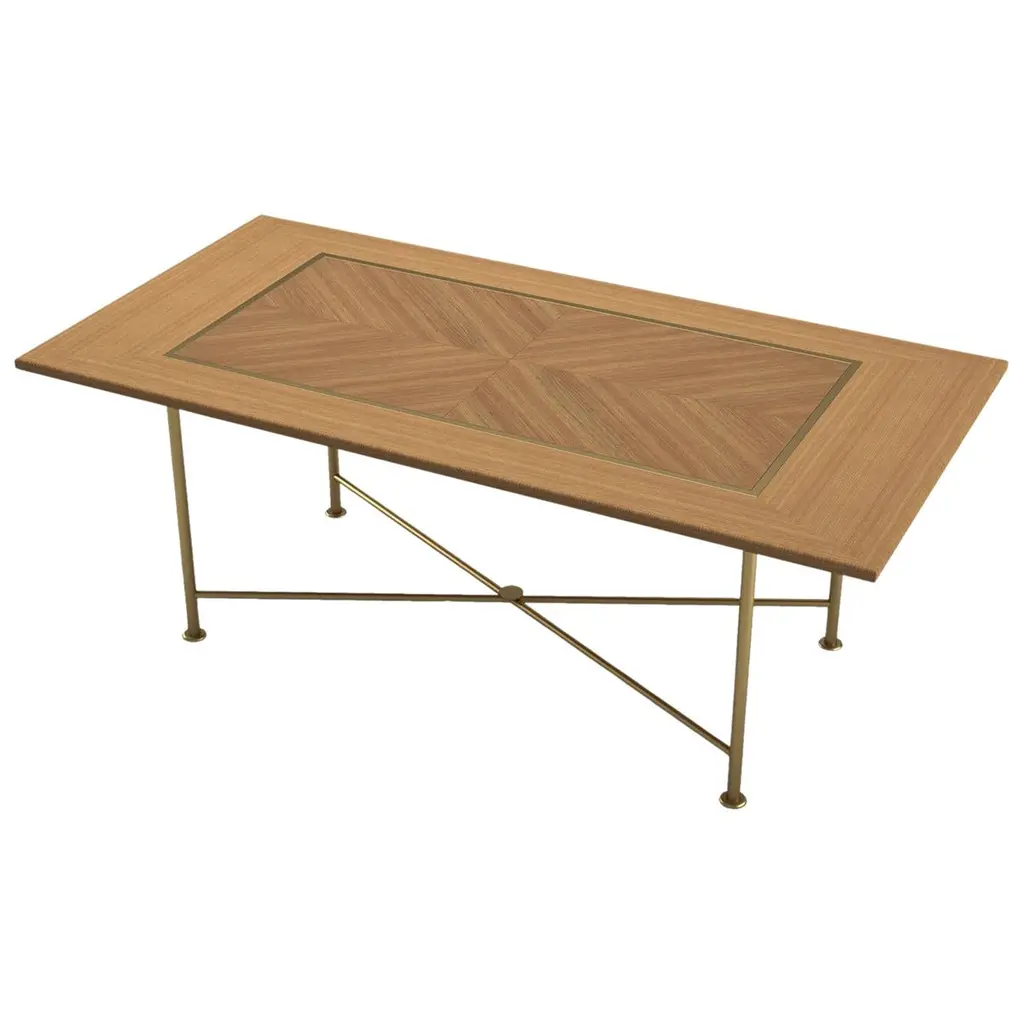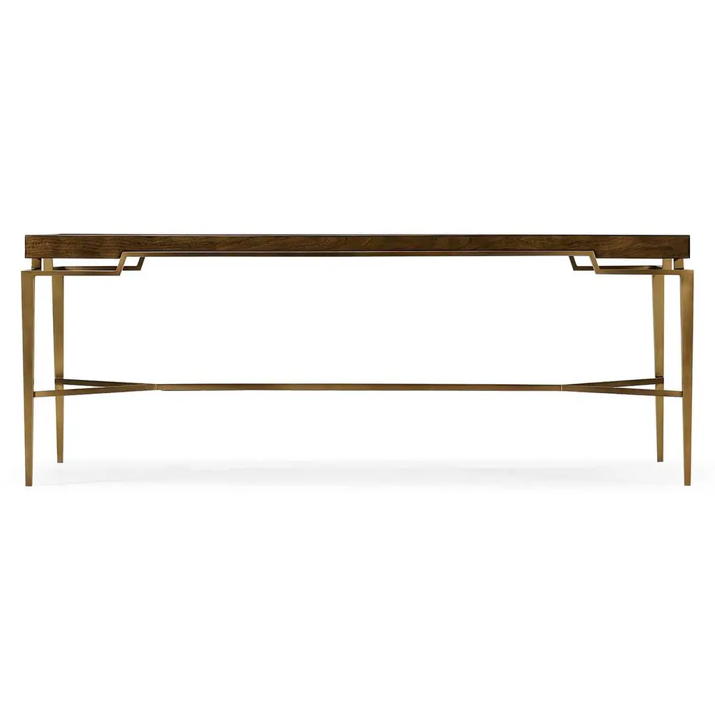 Mid-Century Modern style brass inlaid walnut rectangular form cocktail table. This table features a veneer technique borrowed from the artisans of the Italian Renaissance. Inlays and base are solid brass with an acid dipped, hand-rubbed patina.Dimensions: 50" W x 24" D x 19.25" H.