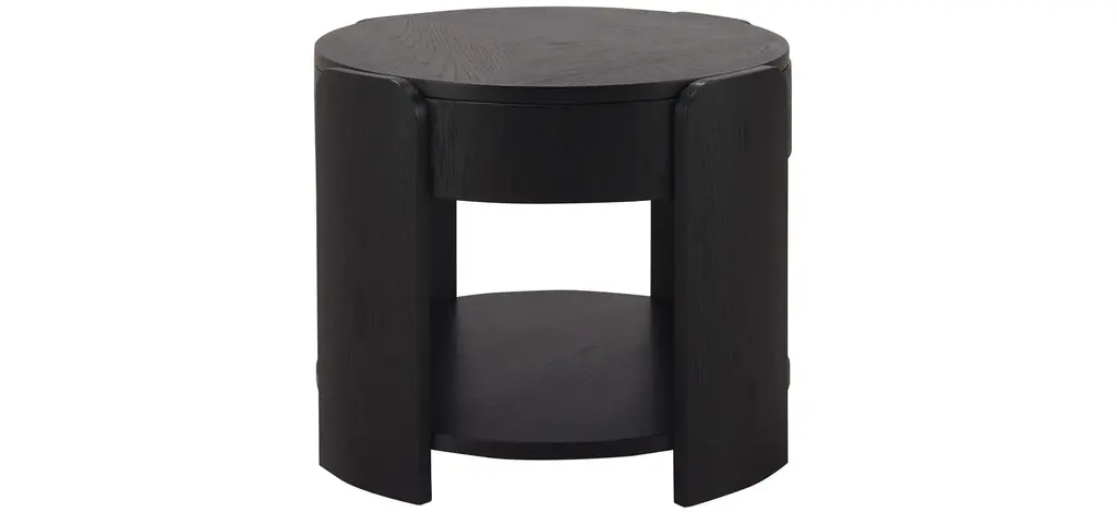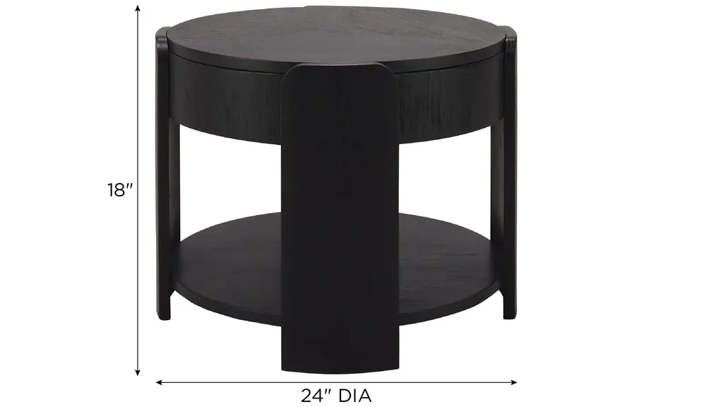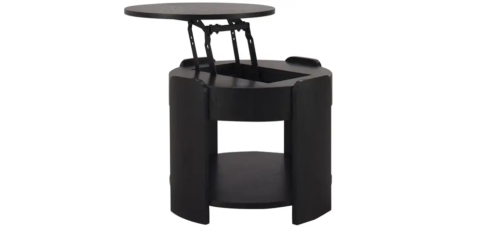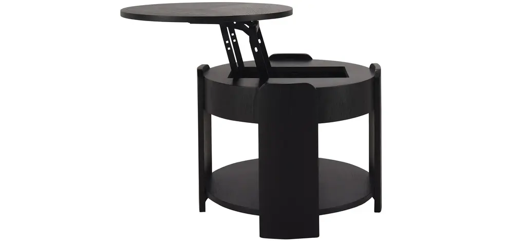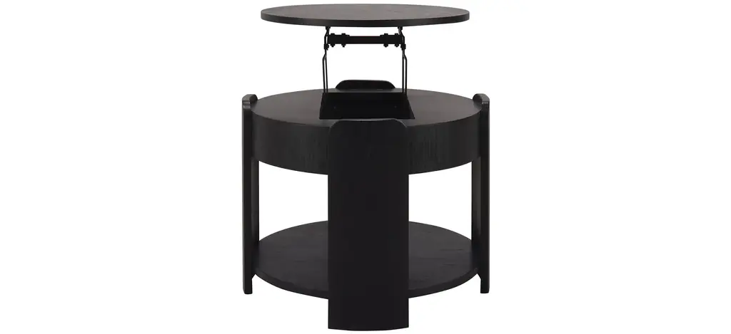 You'll wonder how you lived without the Midland cocktail table in your condo, apartment or den! The pleasing round profile with wide legs is finished in midnight black with an oak grain finish. This awesome table boasts casters and a handy fixed bottom shelf. And, when you need a surface front and center where you're seated, you can raise the top up and out to meet you.