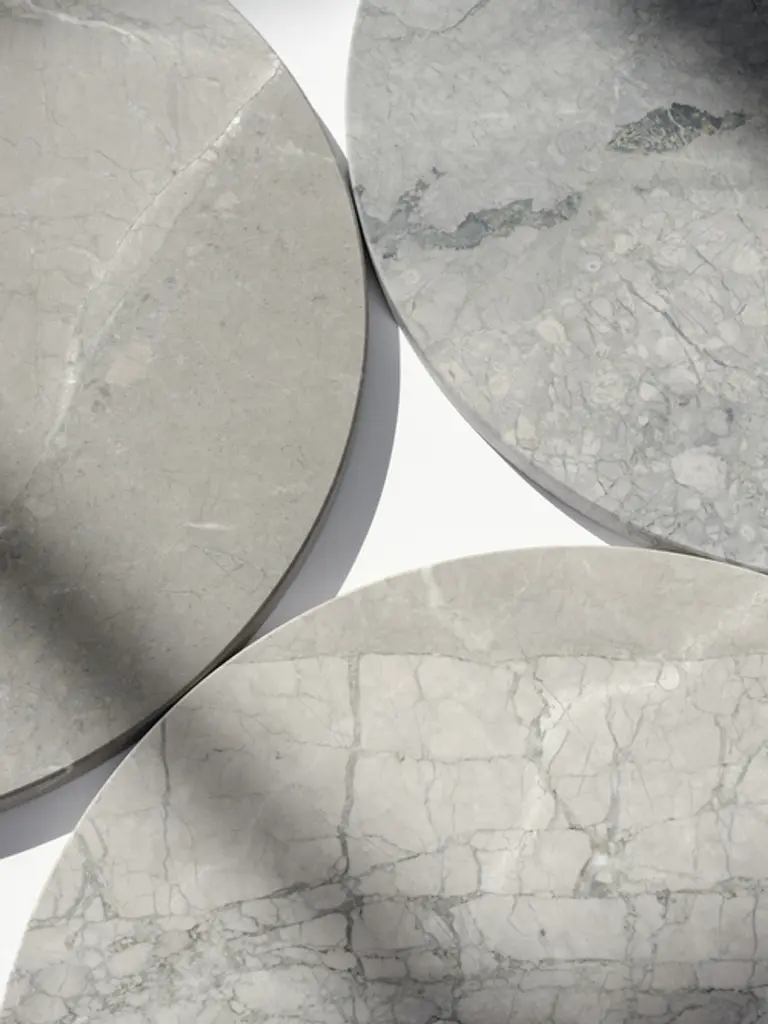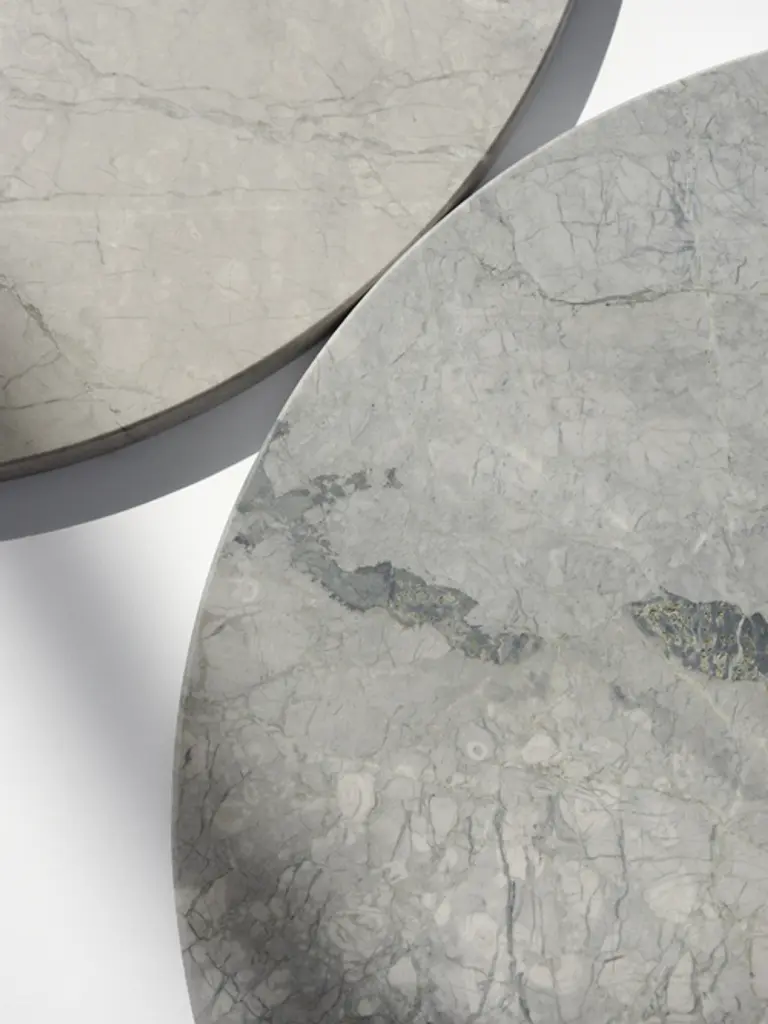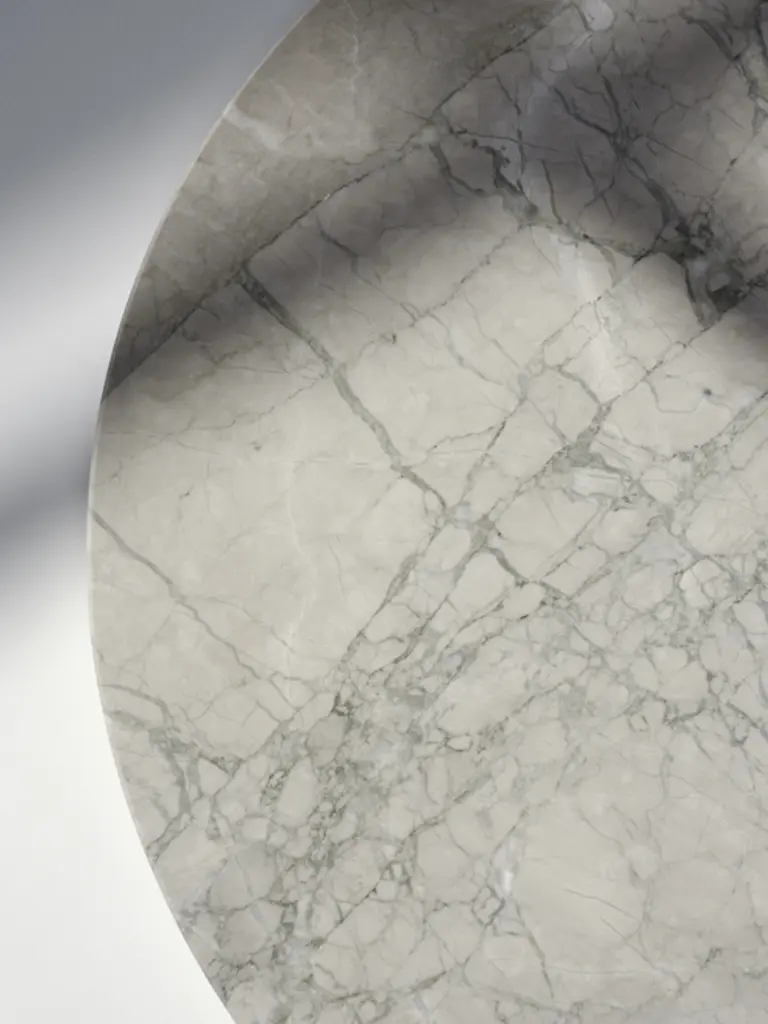 The Midst Coffee Table is a refined blend of sculptural form and luxurious materiality. Its round spun-steel base features a high-gloss finish, creating a striking contrast with the Grey Marble tabletop. The natural stone’s grey tones, intricate veining, and subtle blue undertones are enhanced by a honed matte finish, highlighting its rich details. A timeless design that brings a sense of sophistication to any space.