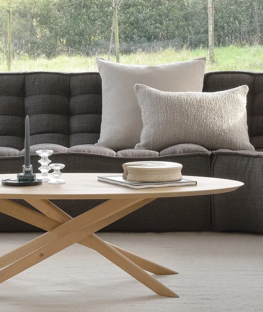 The Mikado coffee table, designed by Alain van Havre, is a complete reinterpretation of the larger dining tables and is a study of balance and symmetry. It is made of solid Oak and is available in three shapes and sizes.