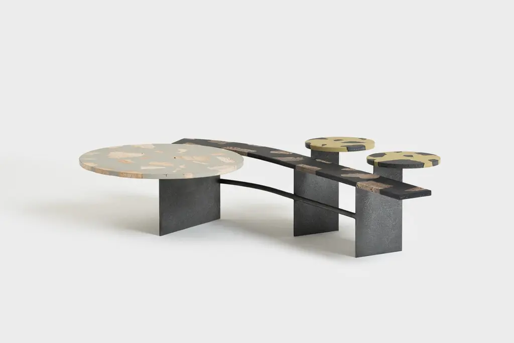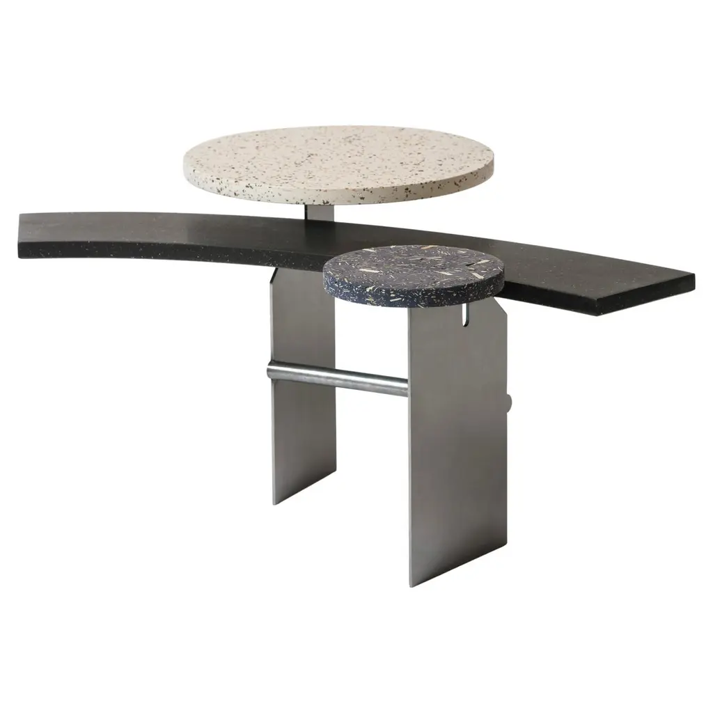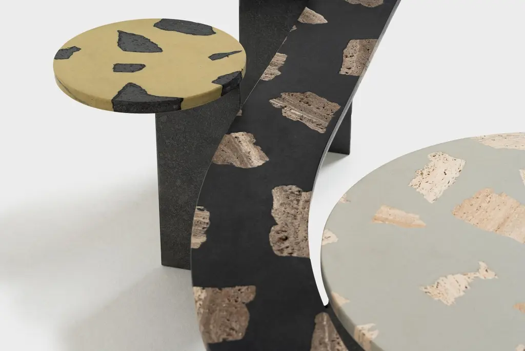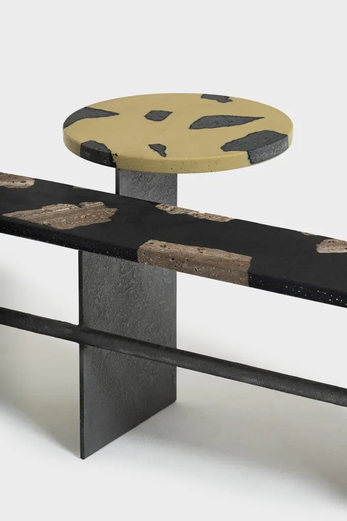 Large central disc made with Roman travertine and grey quartz concrete.Central bar in walnut travertine and black lava stone quartz and small tables inpumice lava stone drom Etna fused with a Vietri yellow quartz system.“It is a research of the contrast and harmony between the solid/rigid, and thesoft/curvacious”.— Andrea SteidlMimante 01 was part of Falling Into Life presented at Milan Design Week 2022, a tribute to early 20th-century Art Nouveau, combining organic lines, decorative richness, and free experimentation. The event explores the relationship between nature, art, and design, bringing projects to life that integrate impressive craftsmanship with innovative materials. The exhibition invites the audience to experience a unique sensory journey through the sinuous, sculptural forms of the pieces, telling a dialogue between the past, present, and future of design, celebrating the uniqueness and creativity of each project.Open edition.Standard production time is approximately 8–9 weeks once current stock is sold out.One piece available for immediate delivery. For projects involving multiple units, production time may vary.