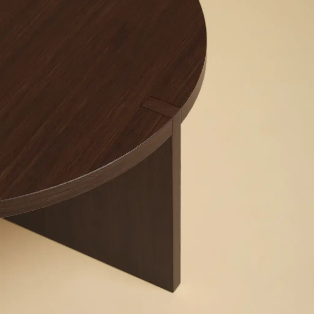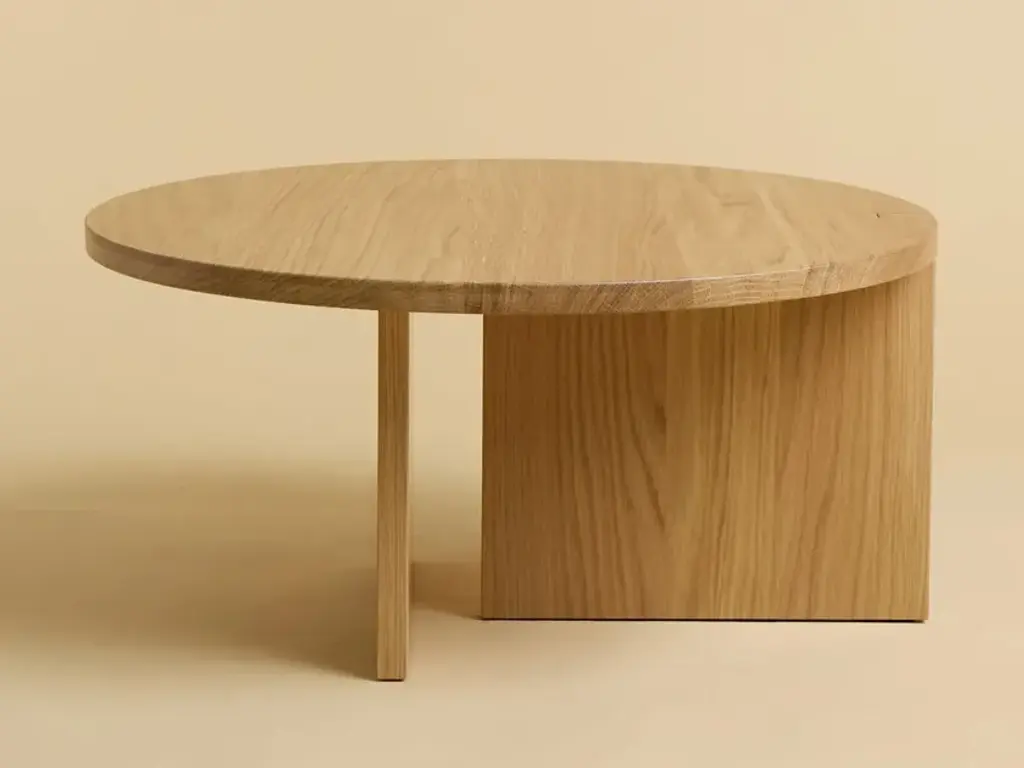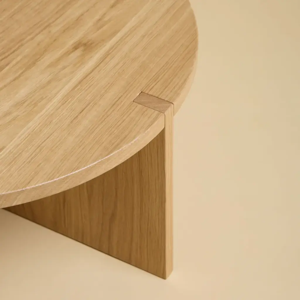 Minami is a low coffee table made entirely of solid oak wood. The top is circular and has a diameter of 60cm, the legs are made from two glued solid wood boards in which one part is interlocked on the top. Available in oak and smoked oak finishes.