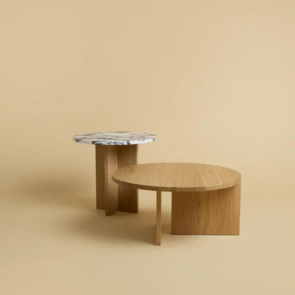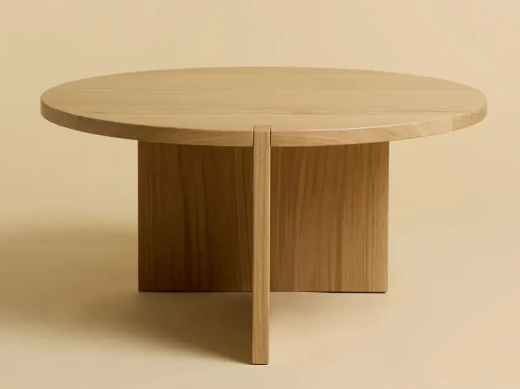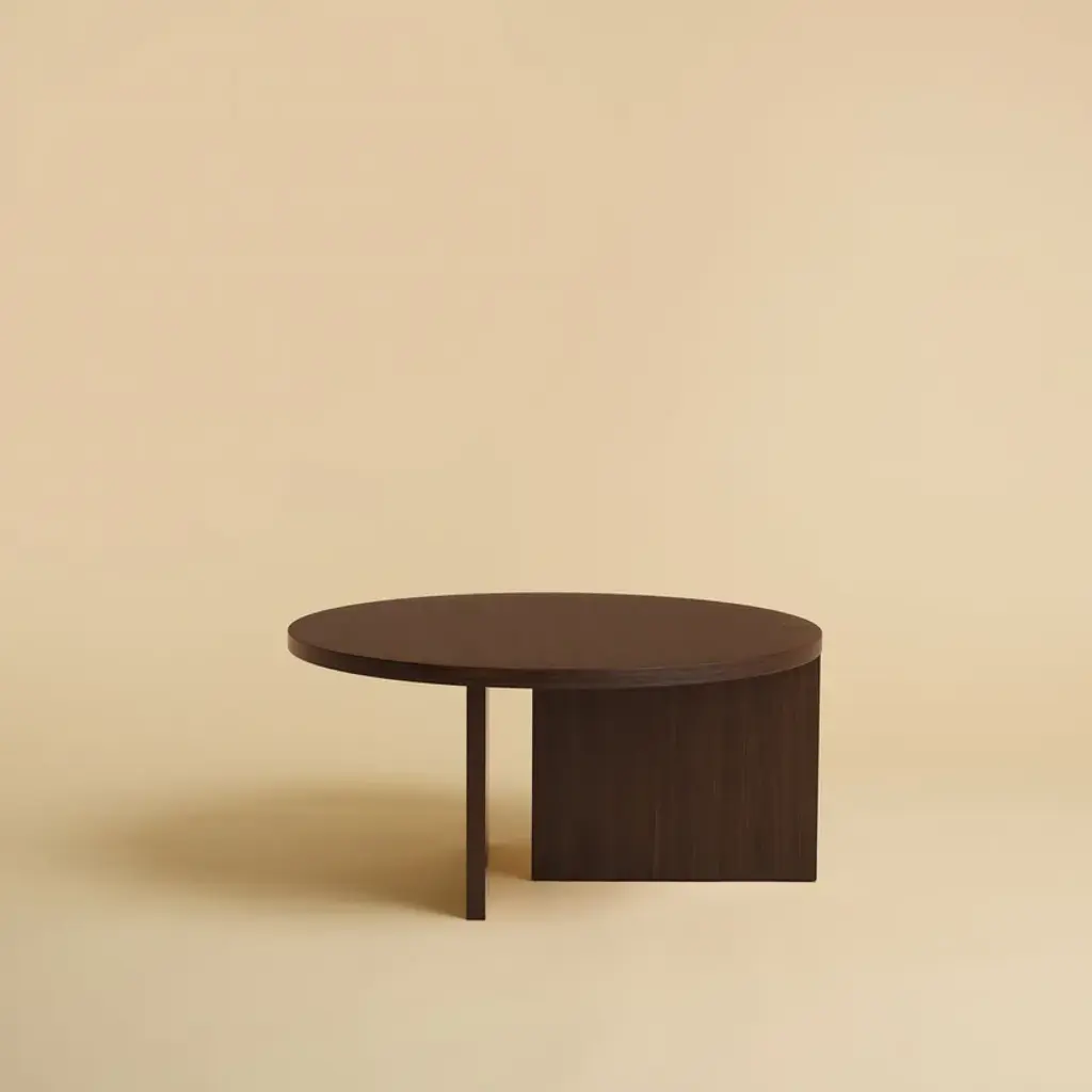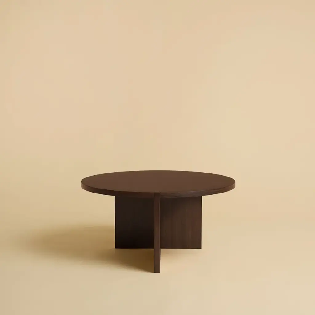 Minami is a low coffee table made entirely of solid oak wood. The top is circular and has a diameter of 60cm, the legs are made from two glued solid wood boards in which one part is interlocked on the top. Available in oak and smoked oak finishes.