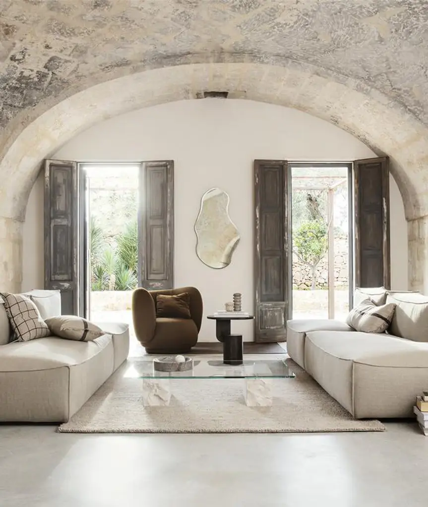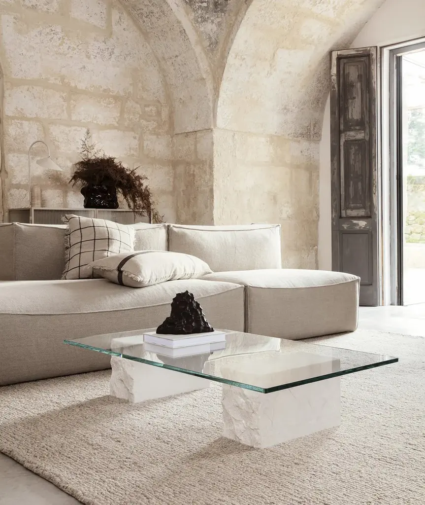 A harmonious marriage of natural materials and contrasting finishes, the Mineral Coffee Table showcases the intrinsic beauty of stone and glass. The smooth, rectangular glass top is placed on a base of two stone blocks – each with one end of which is left unfinished for a raw, textural look.