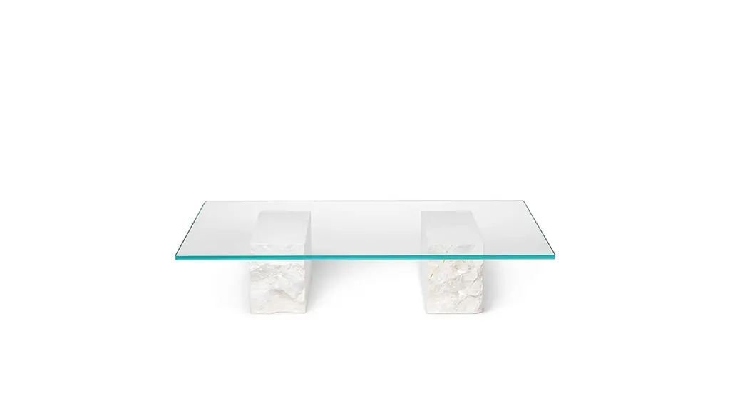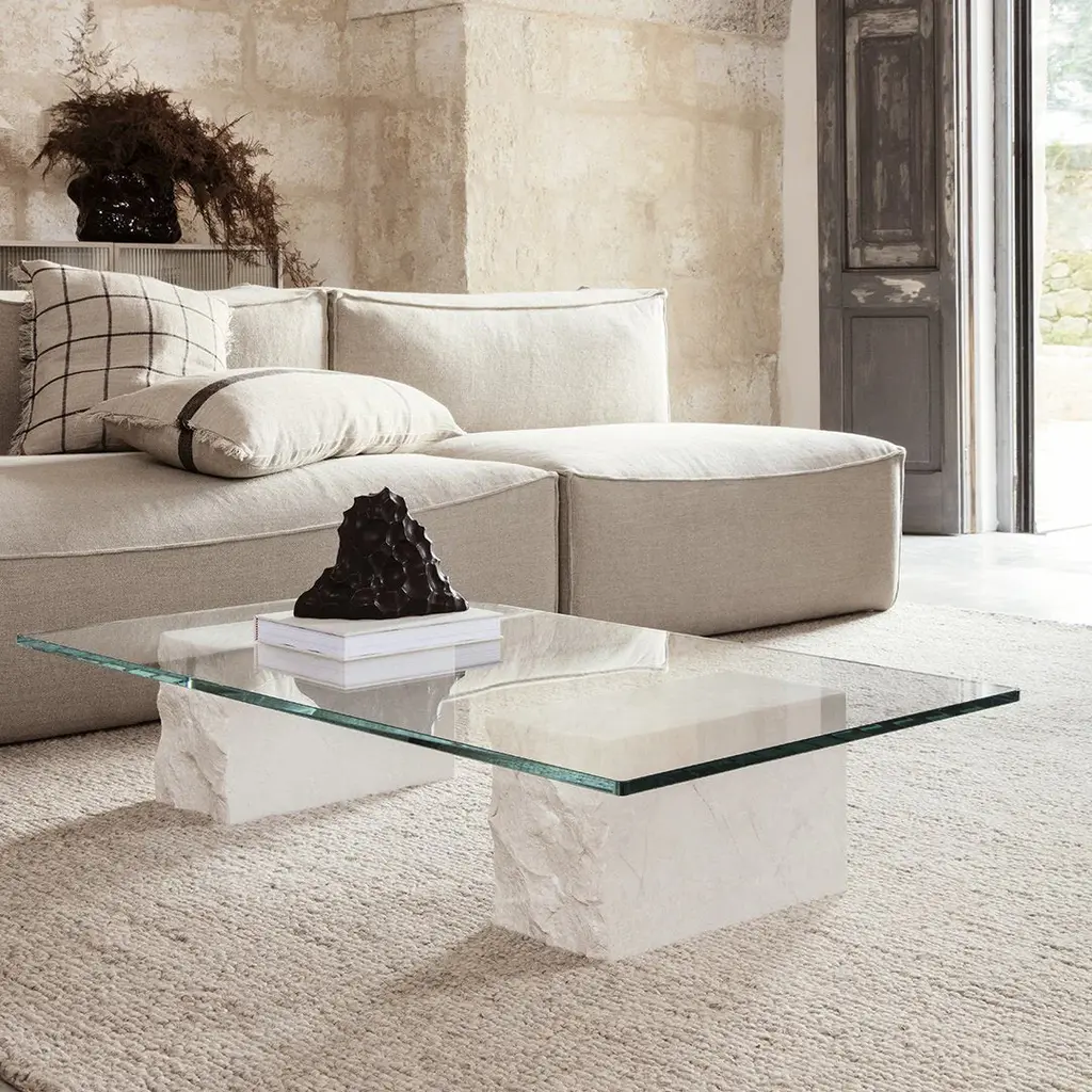 A harmonious marriage of natural materials and contrasting finishes, our Mineral Coffee Table showcases the intrinsic beauty of stone and glass. The smooth, rectangular glass top is placed on a base of two stone blocks – each with one end of which is left unfinished for a raw, textural look.